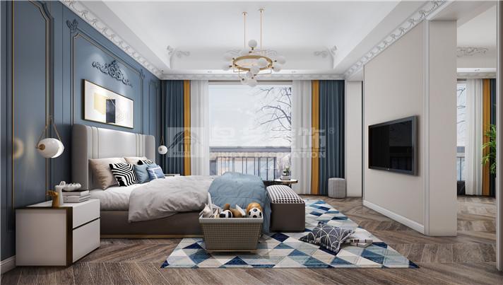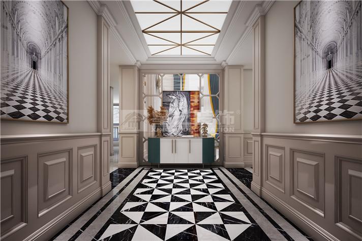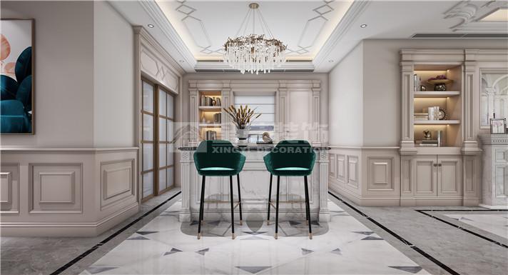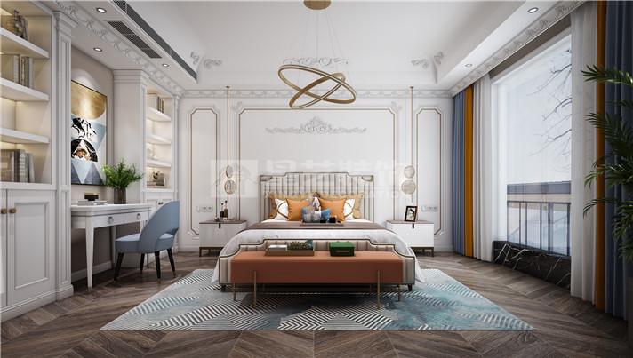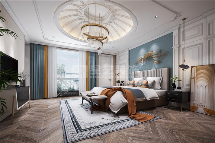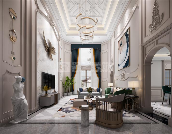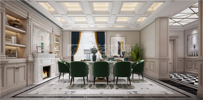 别墅色彩以暖色作为空间的主调,墨绿色点缀其中。通过新古典的家具与金色的软装搭配,法式的浪漫元素延伸其中,打造别具一格的氛围。别墅随处可见对称性的设计,如玄关、壁炉的装饰,灯具的摆设等。客厅与餐厅的艺术吊顶搭配着别致的水晶吊灯,水晶吊灯上垂落的珠帘更好的软化了整体的线条,充分展现了法式风格的魅力。主卧室的设计相对雅致简约,白色调的护墙板、窗帘与地毯搭配出宁静的氛围。舒适的家具是卧室的首选,很好的体现了主人的品味。