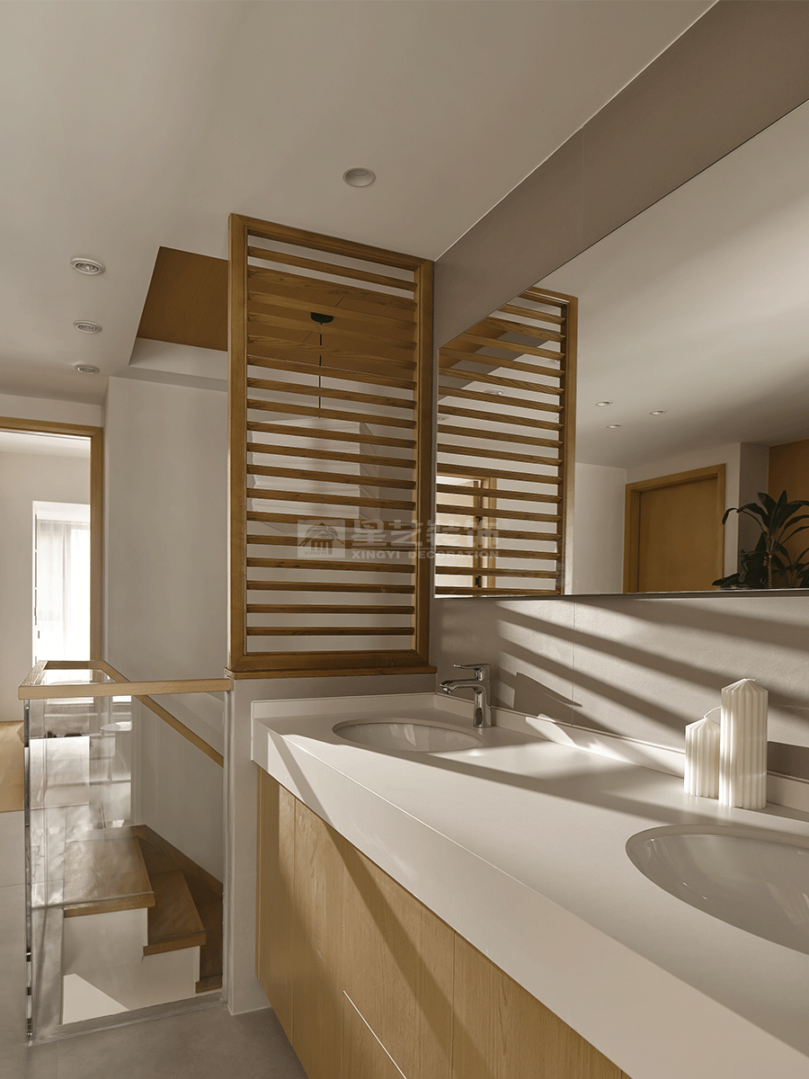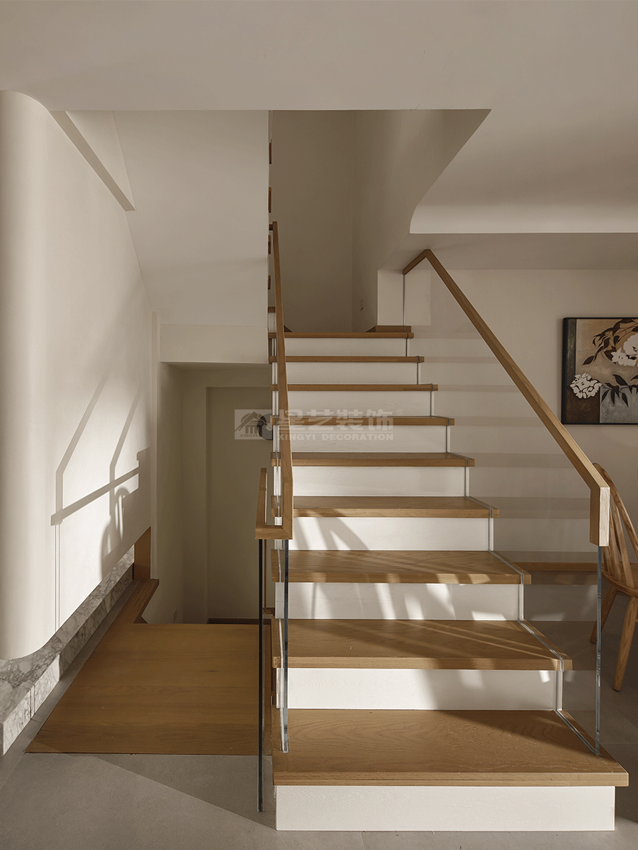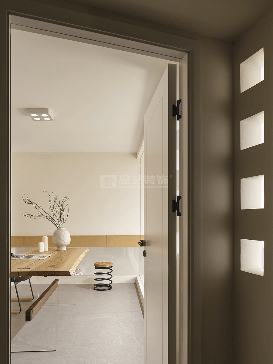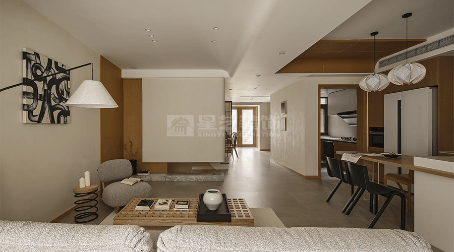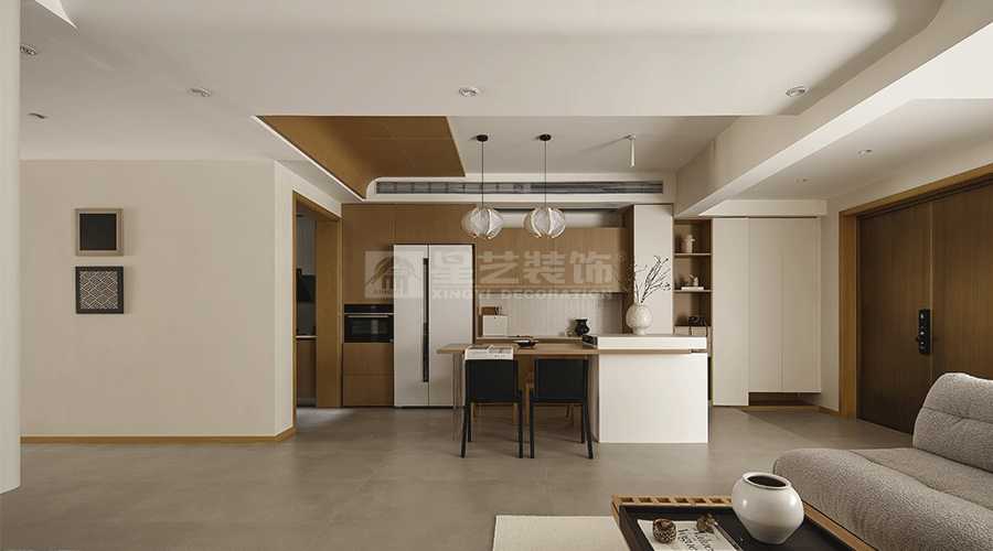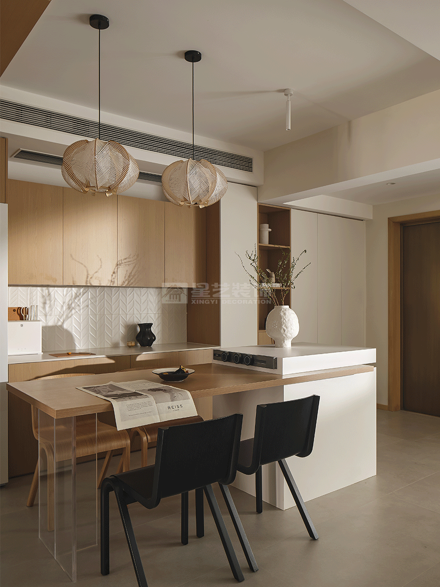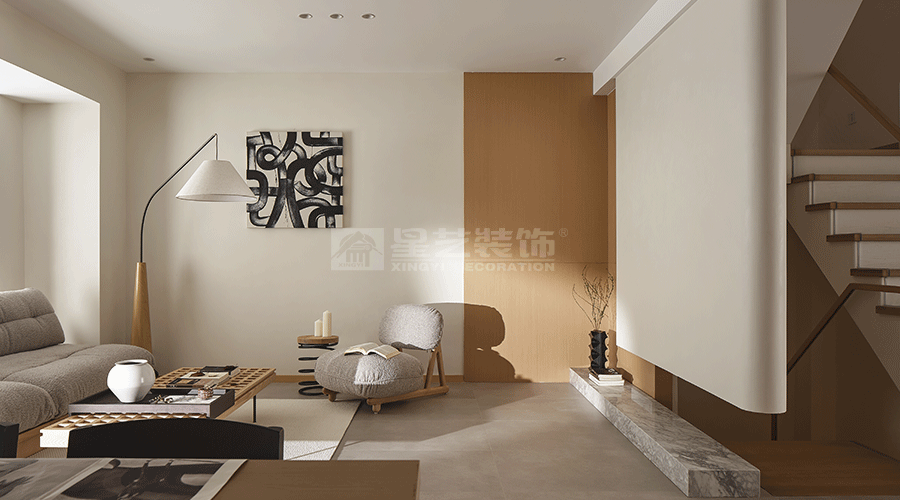 以米白、原木色为基调,搭配质朴的水泥地砖,通过简洁的线条、通透的空间布局,营造出宁静舒适的居住氛围;同时融入木质元素(橱柜、家具)与艺术软装(抽象画、个性摆件),在极简中注入温暖与个性,实现功能与美学的平衡,打造出一个“简约不简单,舒适更治愈”的理想居所。