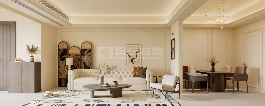 - 客餐一体化:无明显隔断的开放式布局,实现“社交-用餐”动线流畅;沙发区与餐厅区通过地毯、家具自然划分功能。