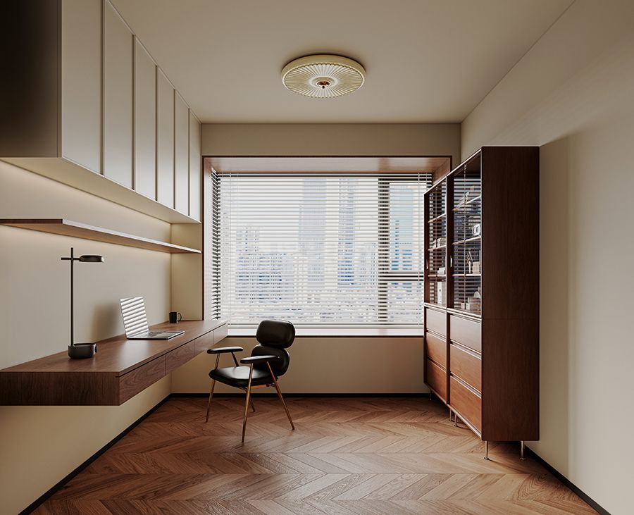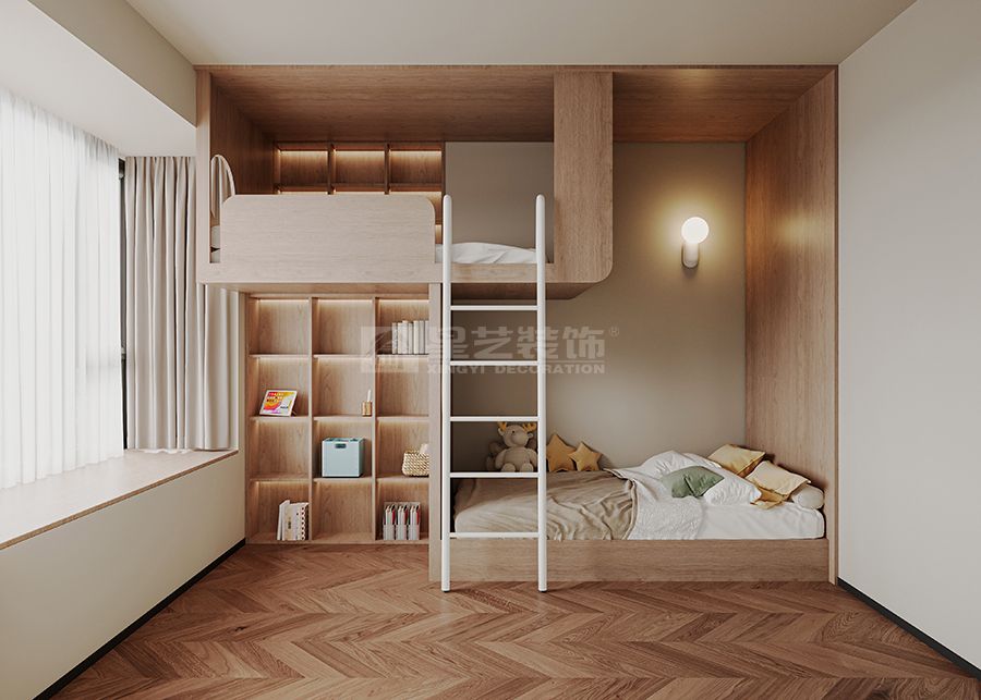 空间兼顾“日常与多元需求”:客餐厅的一体化设计适配社交,书房的悬浮桌可切换为办公/阅读区,儿童房的上下床+置物架则高效利用空间,让家既能承载二人世界的静谧,也能适配家庭成长的变化。