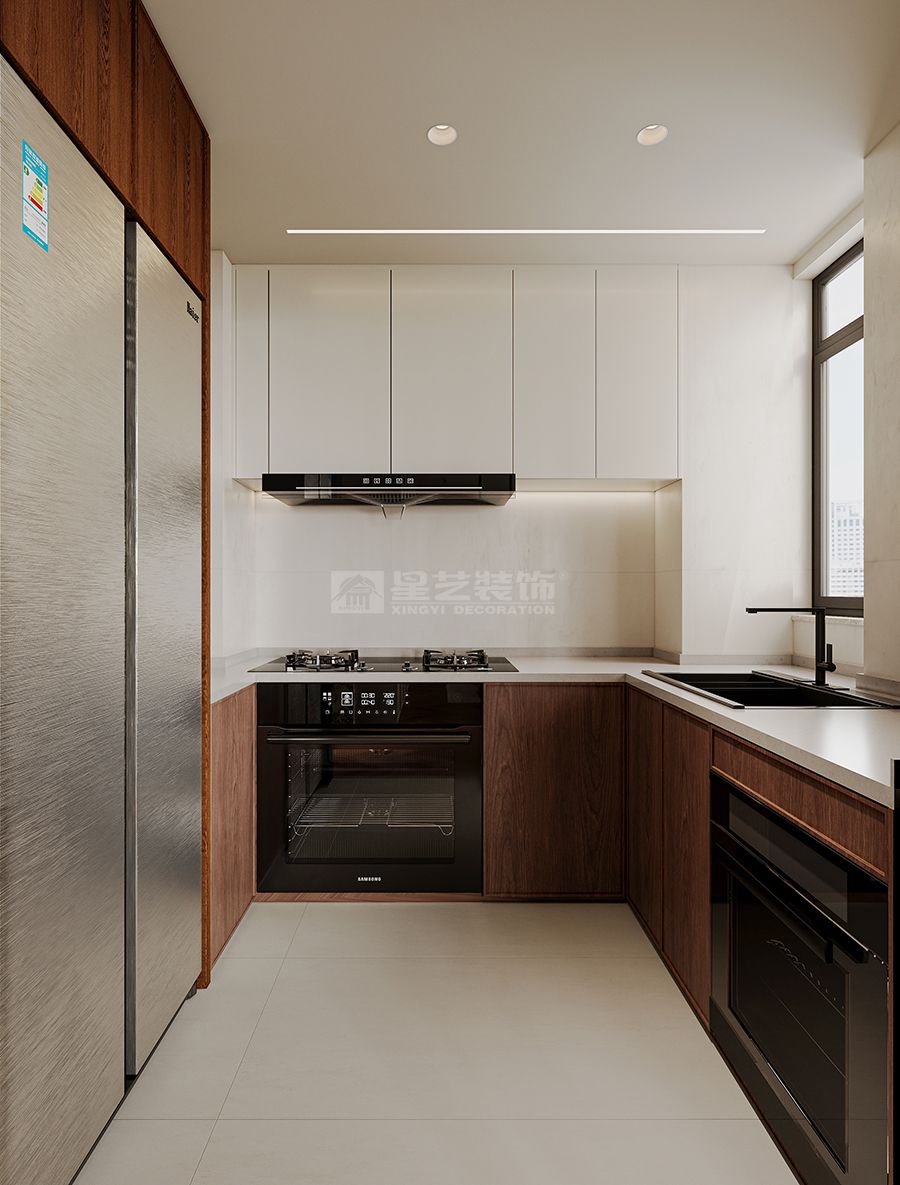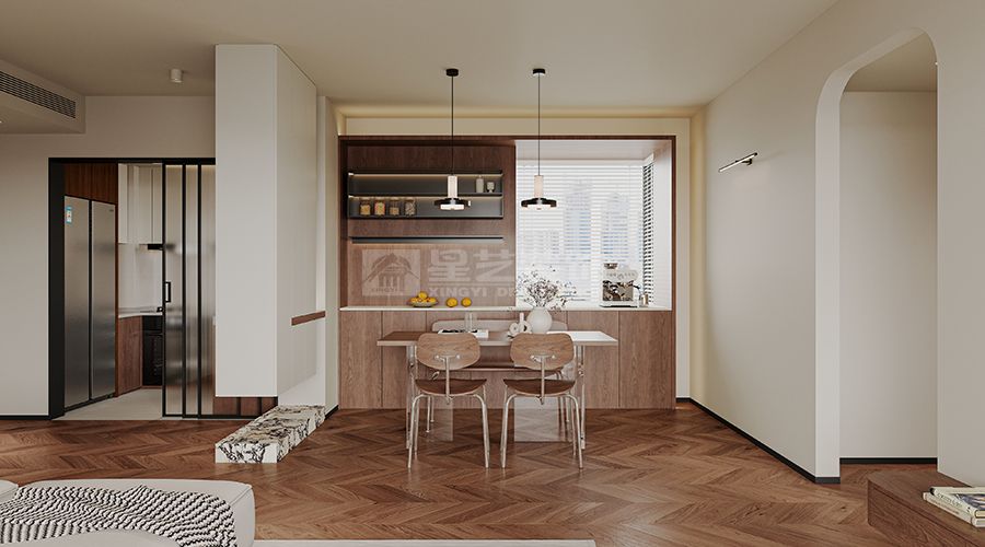 以人字拼深棕木地板为基底,搭配奶白色墙面与深浅木色定制柜,通过材质(哑光柜面+金属细节)、色彩的“轻对比”,让空间在简约中透出精致——比如厨房的深棕柜体+白色台面,既显沉稳又避免压抑。