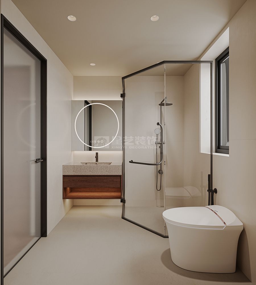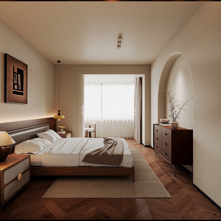 用圆弧门洞、悬浮家具弱化硬朗线条,搭配无主灯+局部吊灯的光影组合(如卧室床头的暖光吊灯),让空间在“精致感”之外,多了松弛的居家氛围;卫生间的玻璃隔断+独立布局,既保障隐私又显通透。