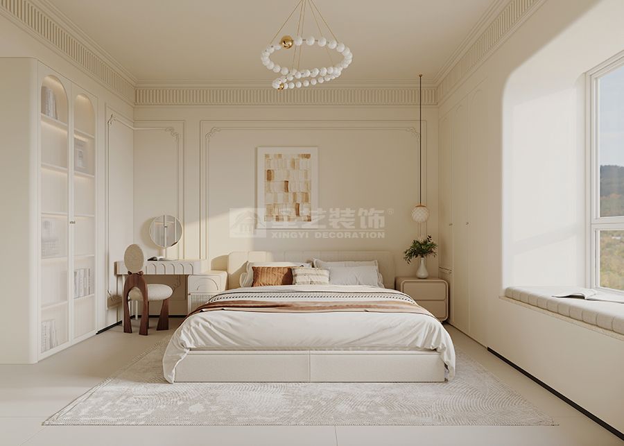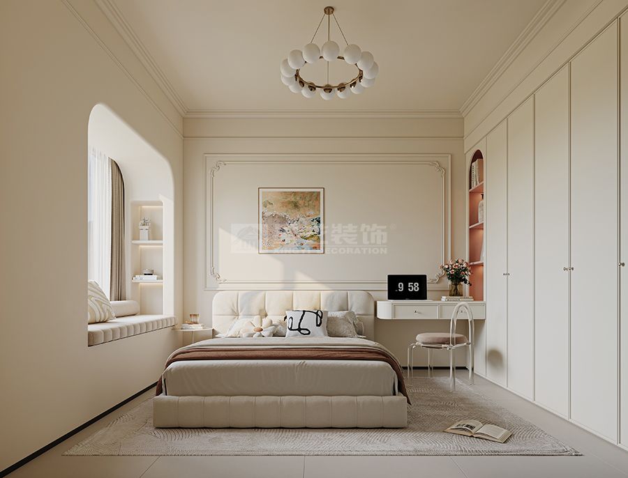 以水晶吊灯、丝绒沙发、艺术挂画等软装点缀法式浪漫:比如卧室的柔纱窗帘+复古床头柜,书房的曲线椅+悬浮书桌,在现代功能中融入优雅细节,让“仪式感”藏在日常起居里。