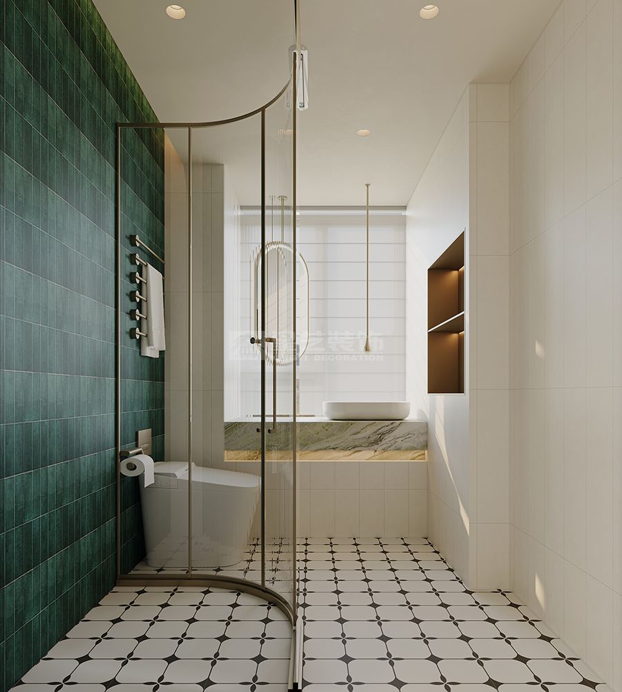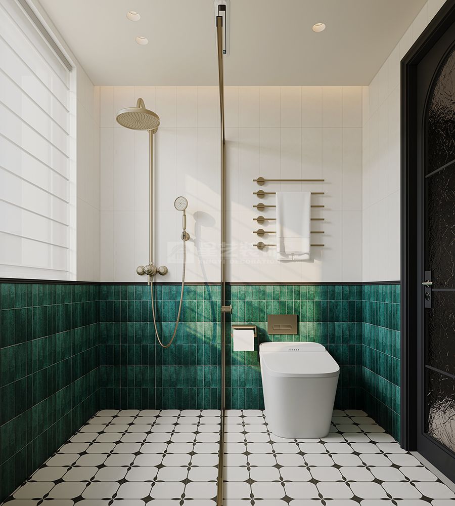 用黑色金属(门框、灯具)、深灰家具作为视觉落点,打破全白空间的单调:厨房的深灰柜体+白色台面、卫生间的墨绿瓷砖,既提升高级感,又让复古氛围更有层次,避免“甜腻感”。