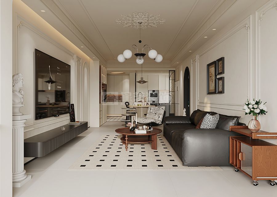 以“白色护墙板+雕花线条”复刻法式优雅,搭配黑白棋盘格地砖、拱形门洞等经典元素,既保留复古韵味,又通过浅色调弱化厚重感——比如客厅的护墙板不做繁复雕花,以简洁线条平衡“古典”与“现代”。