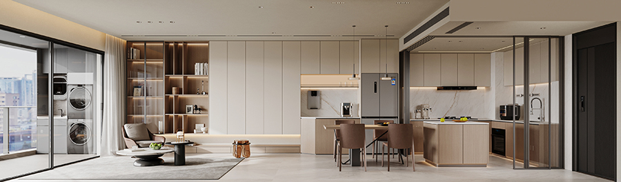 以浅木色地板、暖棕调柜体为空间底色,搭配奶白墙面弱化冷硬感,让整体氛围像“裹了层柔光滤镜”——比如客餐厅的同色系家具与柜体,既保持视觉统一,又传递出松弛的居家温度。