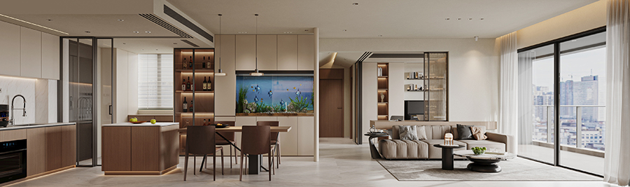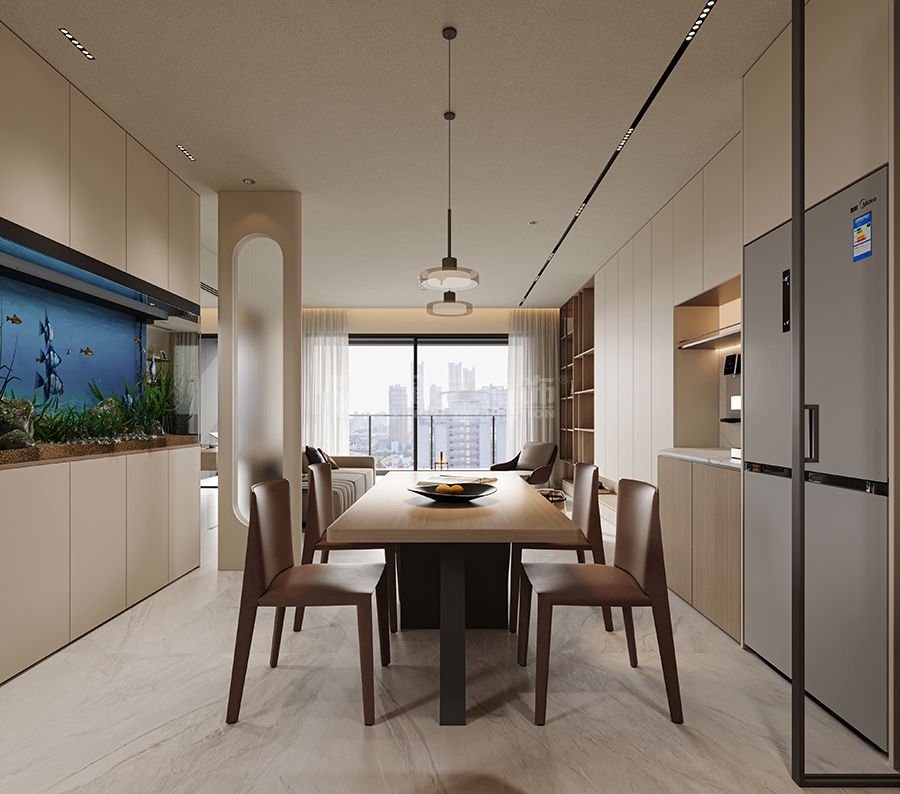 用“隐形设计+点睛元素”提升精致度:嵌入式鱼缸作为客餐厅的视觉焦点,既打破单调又添生活趣味;圆弧门洞、悬浮柜体弱化硬朗线条,金属小摆件、艺术挂画则在细节处透出轻奢感,不刻意却有品质。