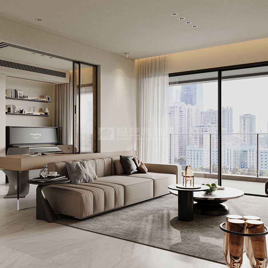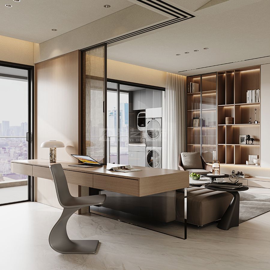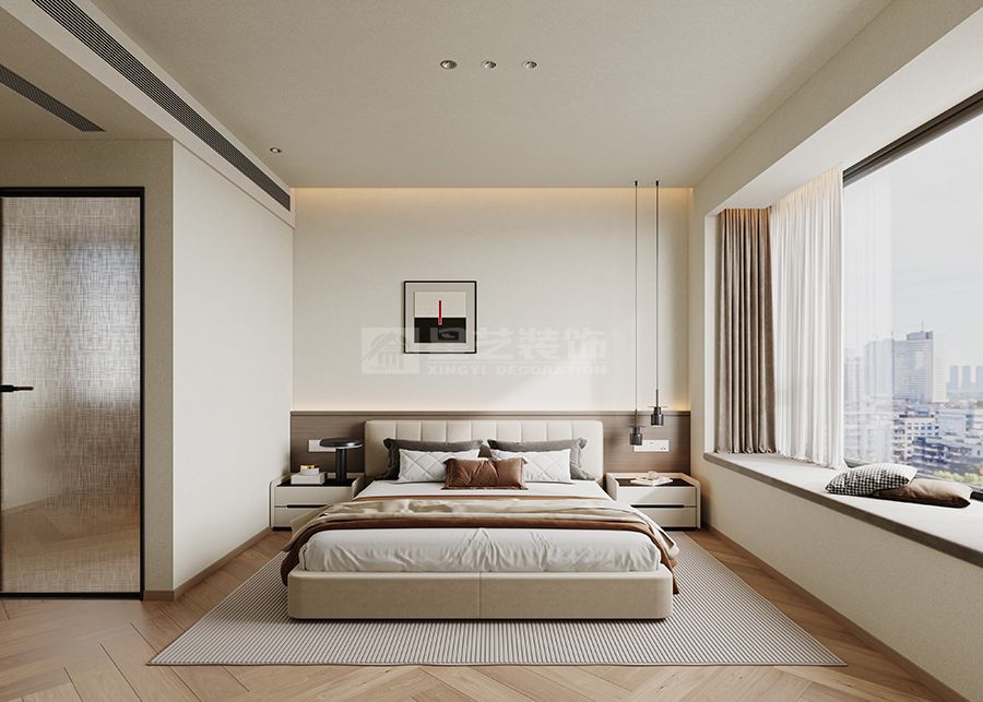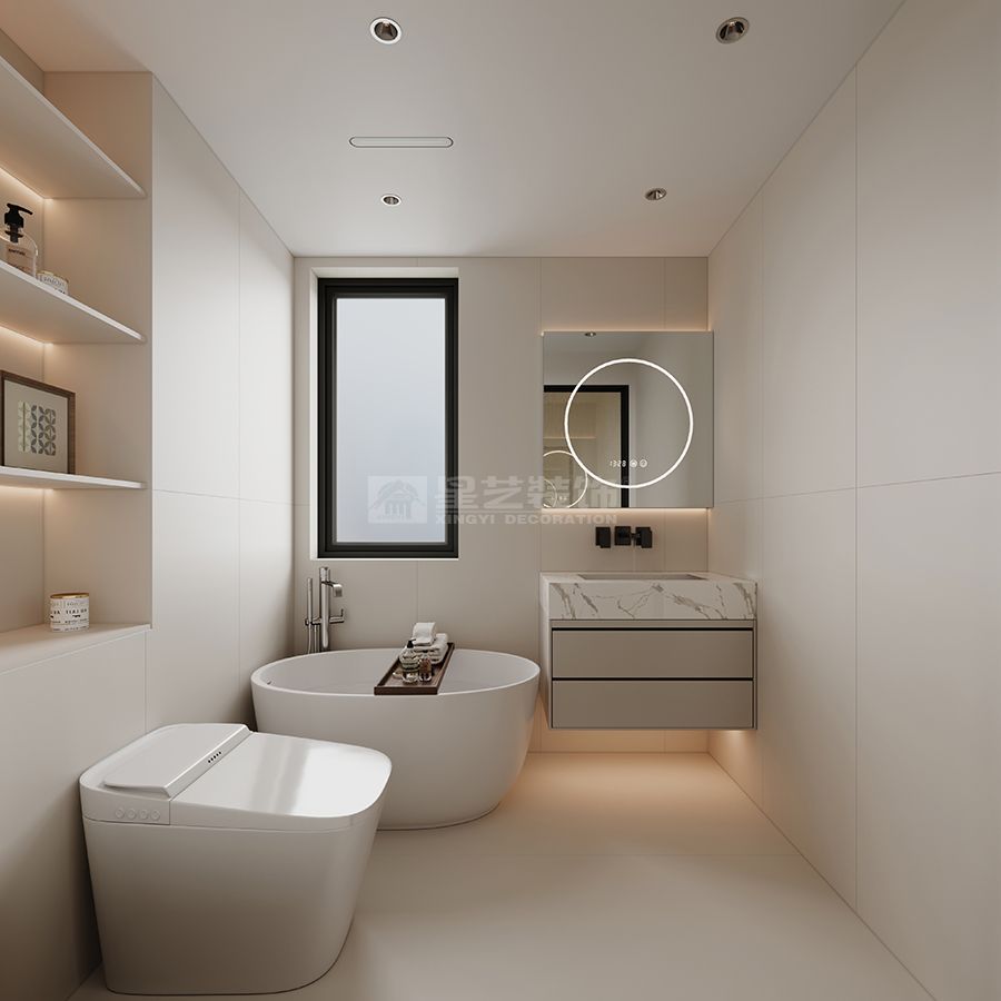 大面积落地窗引入自然采光,搭配无主灯+局部氛围灯(如卫生间壁龛灯、卧室悬浮灯),让空间在明亮中多了柔和层次;玻璃隔断、开放格的运用,进一步强化通透感,避免空间局促。