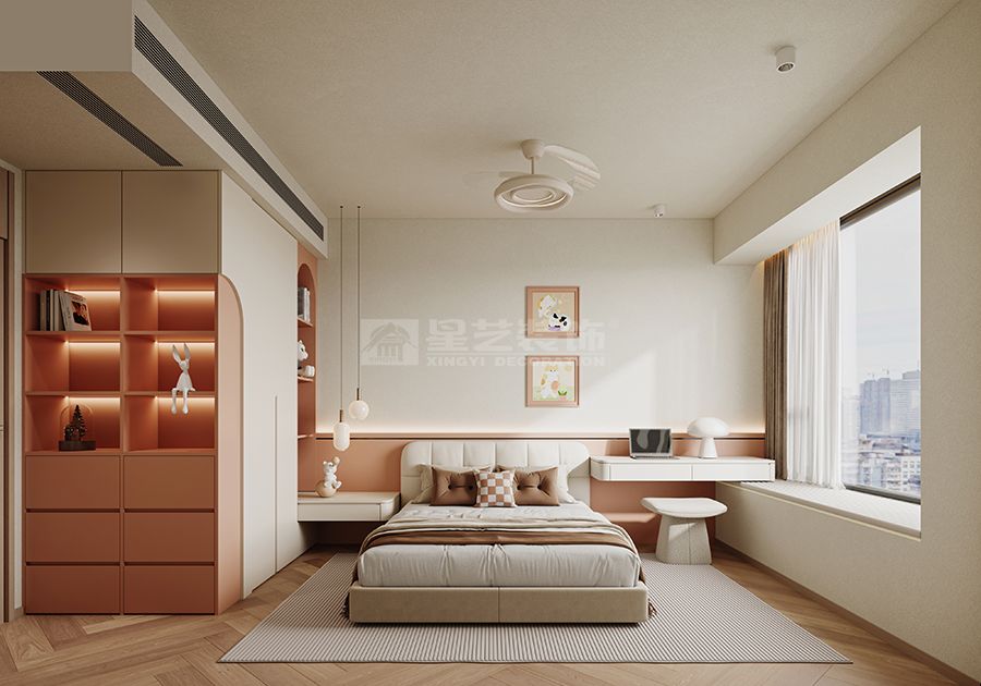 收纳与场景兼顾实用与温馨:整面定制柜藏起杂物,卧室的飘窗书桌、书房的开放式置物架则适配日常办公与阅读;不同卧室的软装细节(如配色、摆件),既保持风格统一,又能适配不同居住者的喜好。