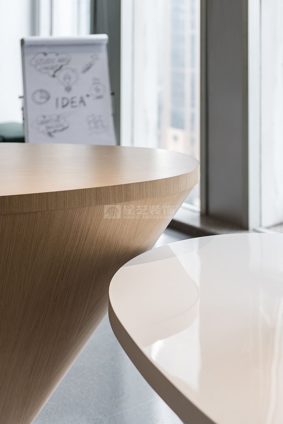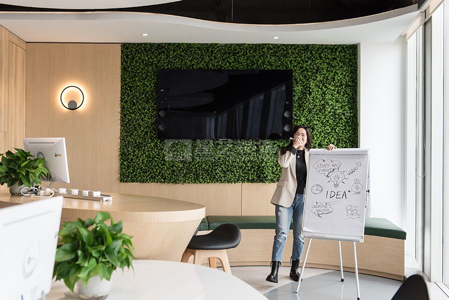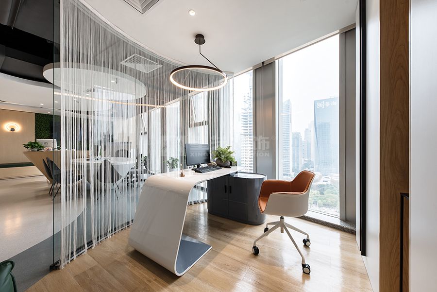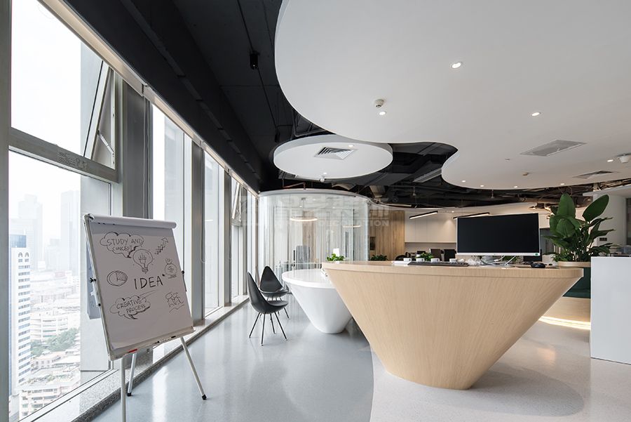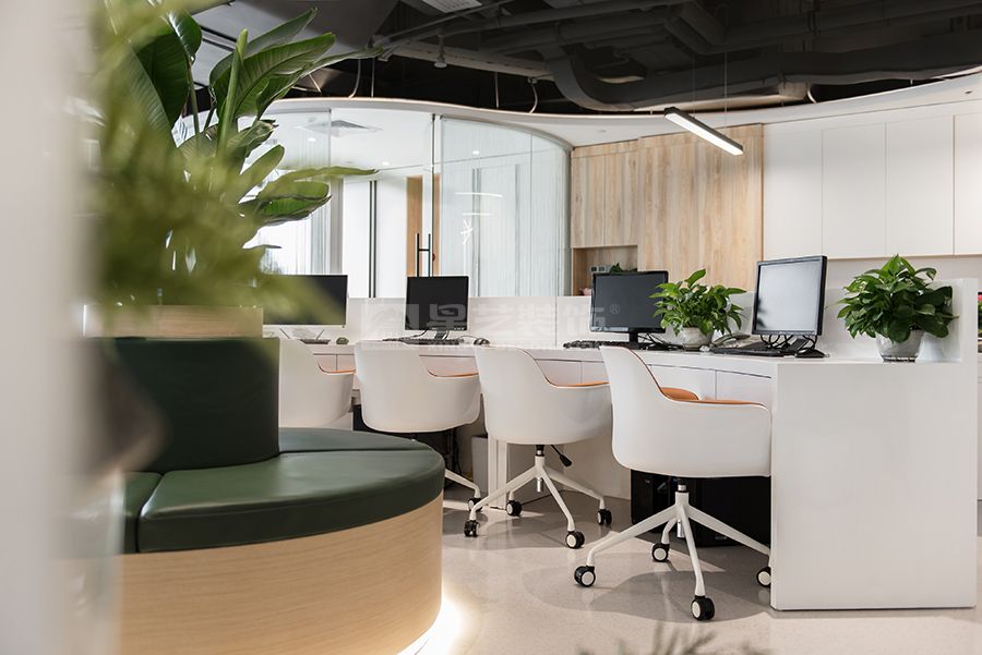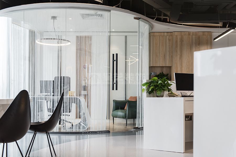 现代风格办公空间,采用流线型和圆弧元素设计,色调白色,木色为主,深色点缀,打造一个松弛休闲的办公空间。