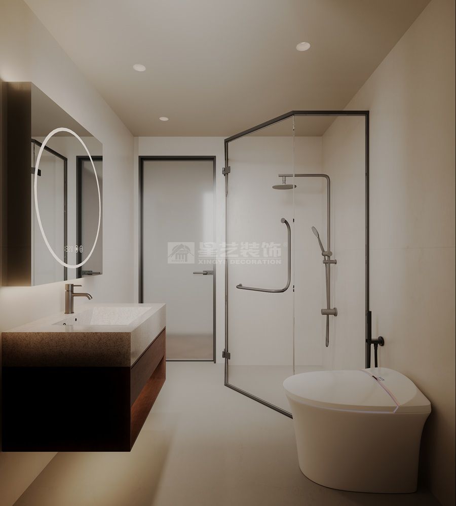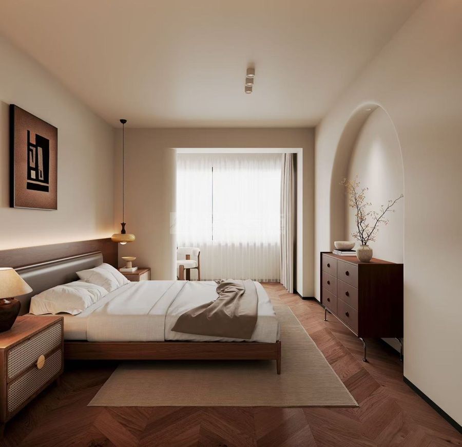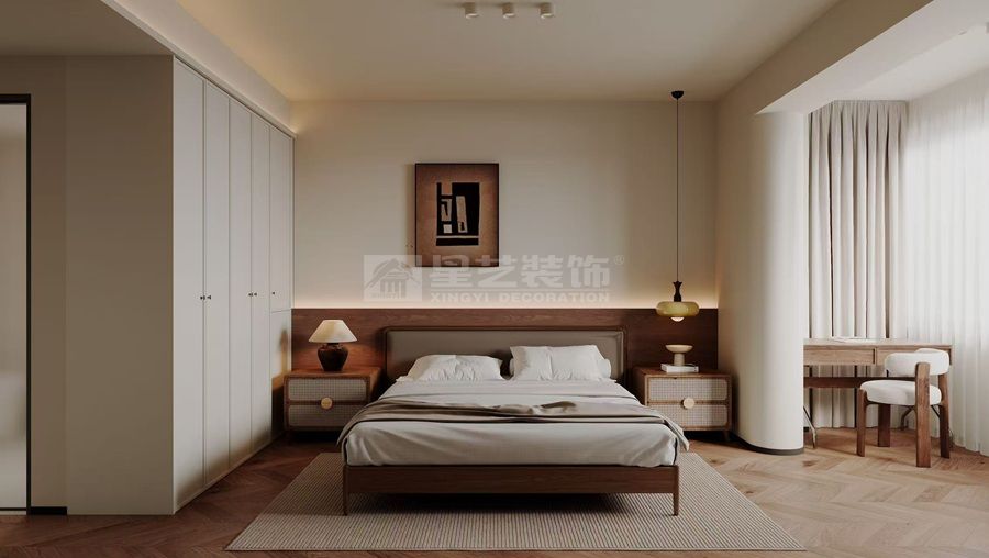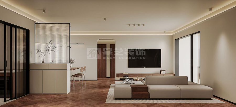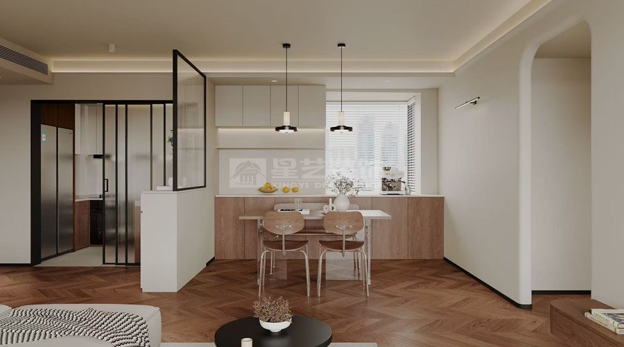 以暖白色哑光柜体、胡桃木色台面/家具、人字拼木地板为主,搭配大理石纹理装饰件,呈现自然温润的质感;线性灯光(营造柔和氛围)、悬浮式柜体(弱化厚重感)、透明餐椅(减轻视觉负担)等元素,强化了“轻简”的现代感;既满足现代家庭的“互动式生活”需求(客餐厨联动),又通过家政区的独立设置提升实用性,是“美学与功能平衡”的当代居住空间设计案例。