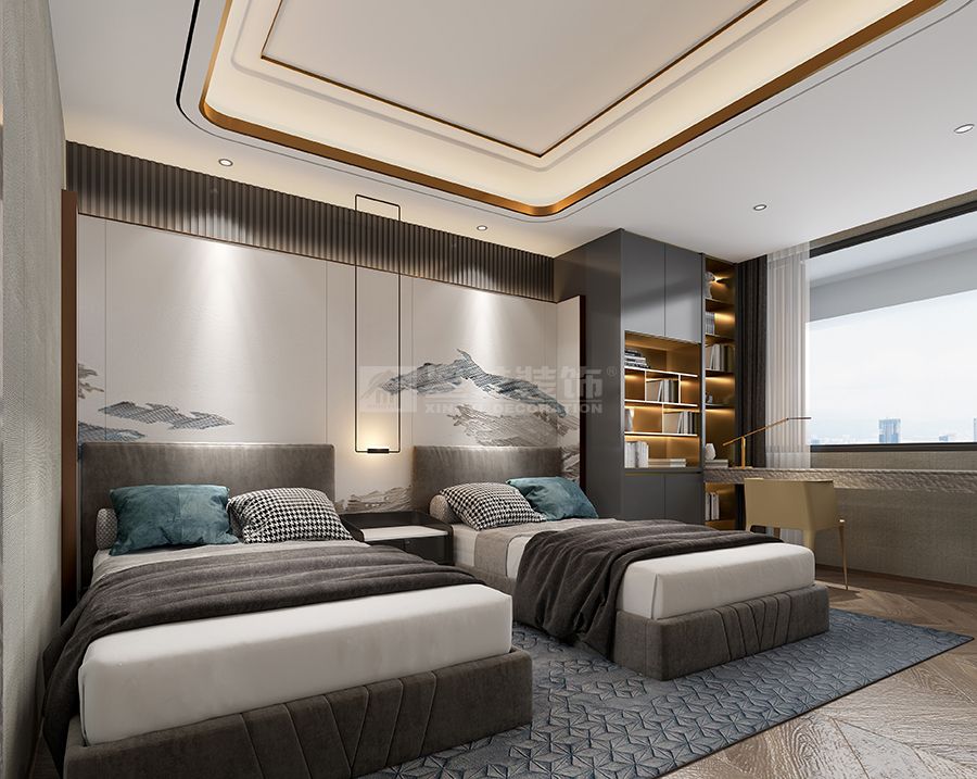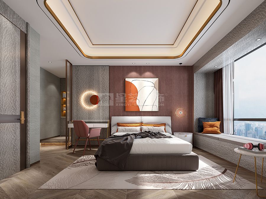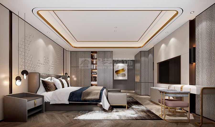 色彩:以中性色调(黑白灰、奶咖色)为基础底色,搭配金属色或跳色(墨绿、脏粉)来强化奢华质感。色彩的运用需适度克制,避免产生视觉冲突,暖灰色调与原木饰面相搭配,能够营造出温馨舒适的氛围。