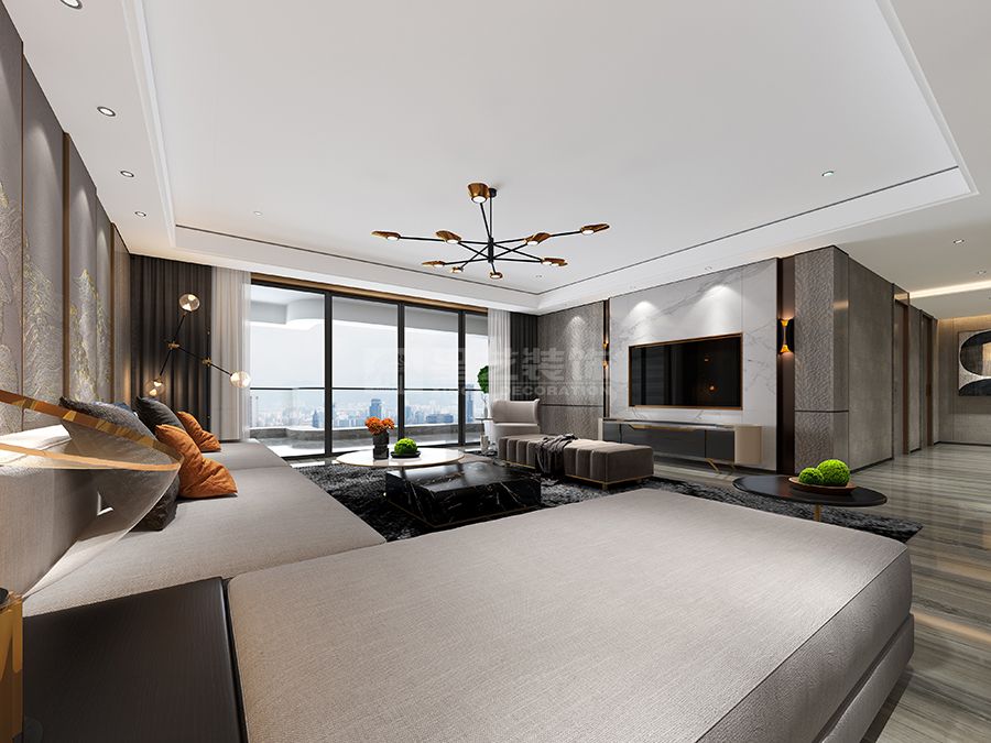 自然采光:大平层应充分利用270°宽景窗户,让阳光洒满每一个角落。客厅采用对称式布局,并结合落地窗设计,增强了空间的互动性与开阔感。