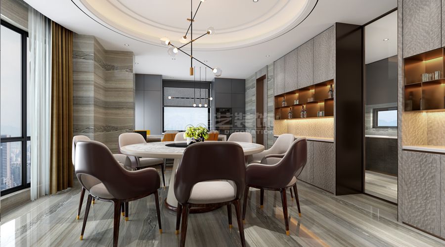 造型:家具和灯具的造型简洁大方,注重将功能性与美观性有机结合。无拉手柜体、悬浮式结构,以及弧形沙发或岛台的设计,通过柔化空间边界,增添了空间的艺术氛围。