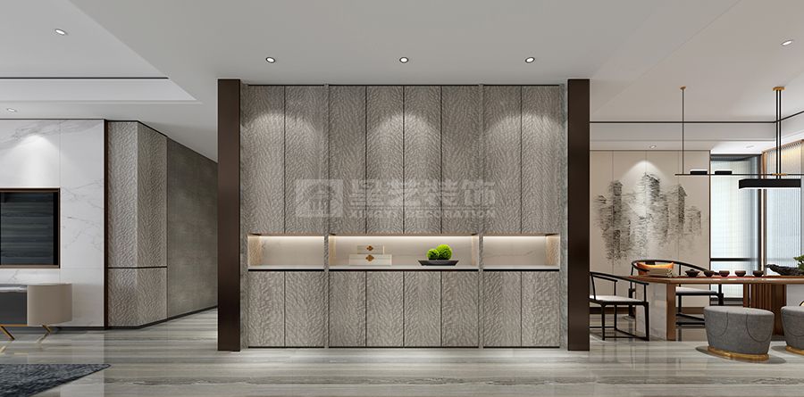 视觉焦点:通过设置局部亮点(酒柜、装饰画)来打破空间的单调感,营造出空间的张力。客厅以金属装饰画或大理石茶几为中心,搭配低饱和度的软装,确保整体风格的协调性。