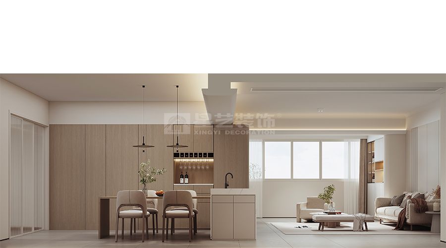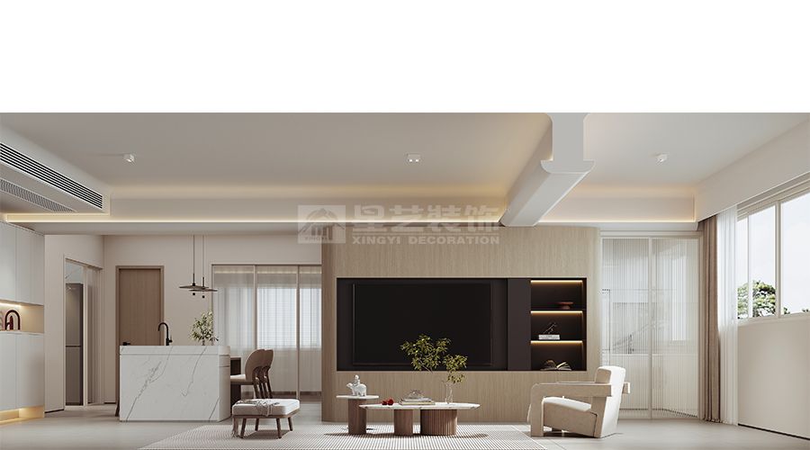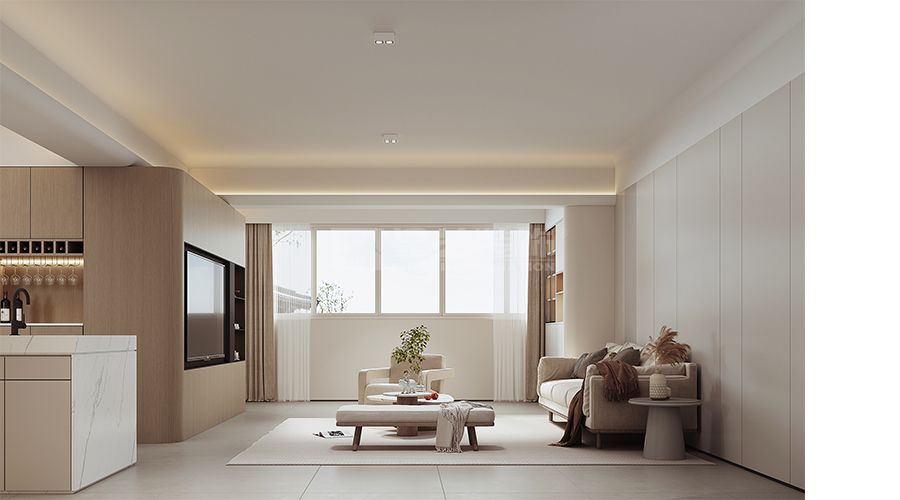 本空间以「简而不空,温而不燥」为核心设计理念,将现代简约与自然温润相融。浅木色与米白为主调,弱化繁复装饰,用利落的线条勾勒空间轮廓;隐藏式灯光与通透的长虹玻璃,让光线自然流淌。电视墙一体化柜体兼顾收纳与展示,大理石岛台衔接餐厨与客厅,在功能与美学的平衡中,营造出松弛且有质感的生活氛围。