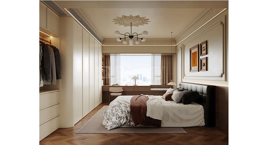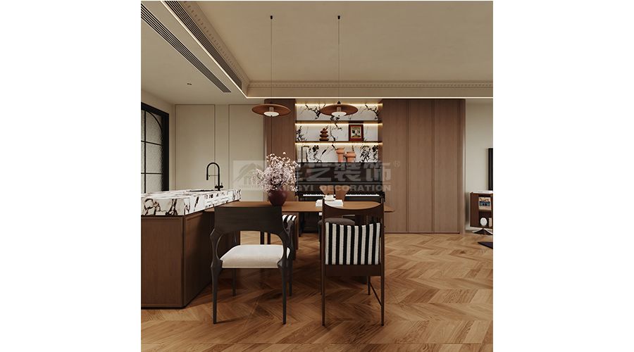 本空间以「复古与现代共生」为设计内核,将法式线条的优雅与现代简约的实用相融。深棕木调打底,搭配人字拼地板与石膏雕花顶,勾勒温润质感;大理石、长虹玻璃等材质碰撞,弱化空间边界。钢琴区与客餐厨一体化布局,在保留古典韵味的同时,用简洁的柜体、柔和的灯光营造松弛感,让复古风情落地于当代生活。