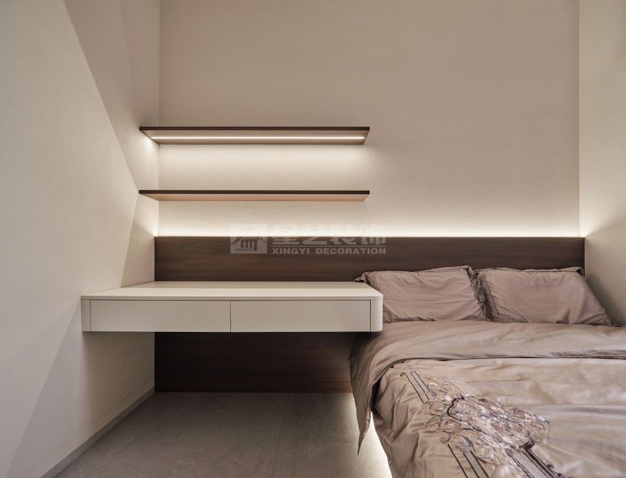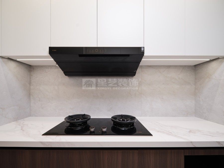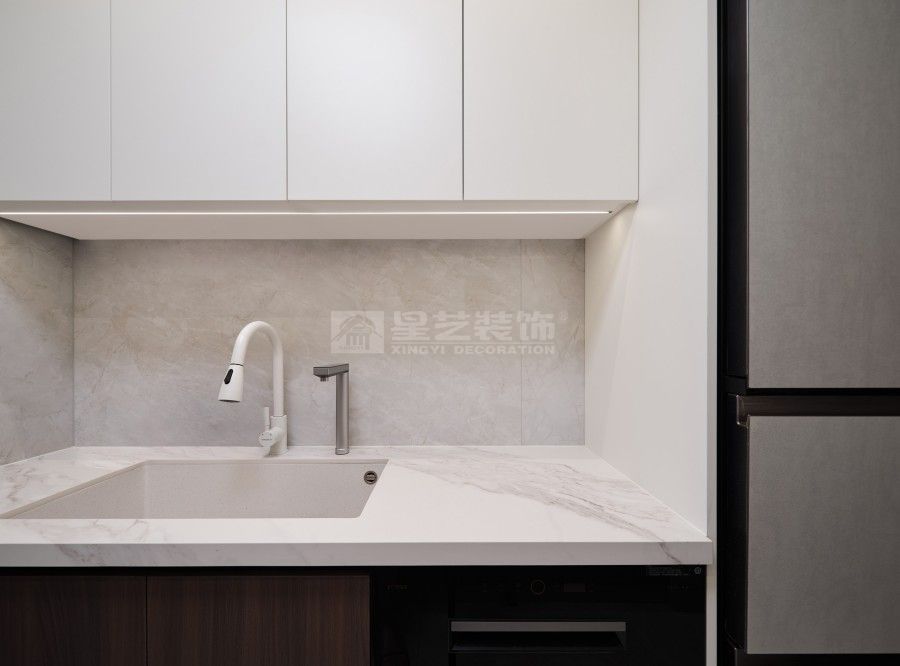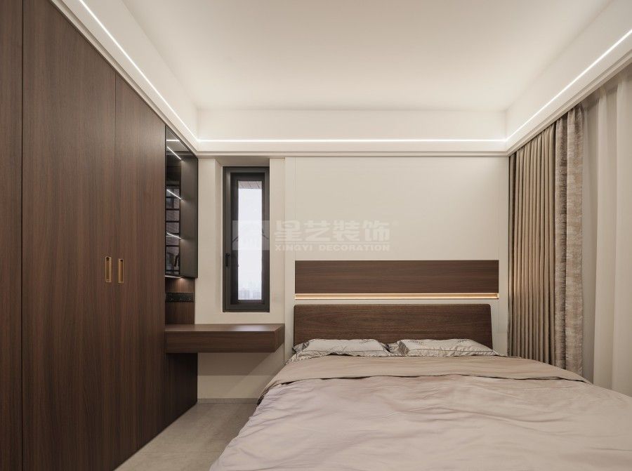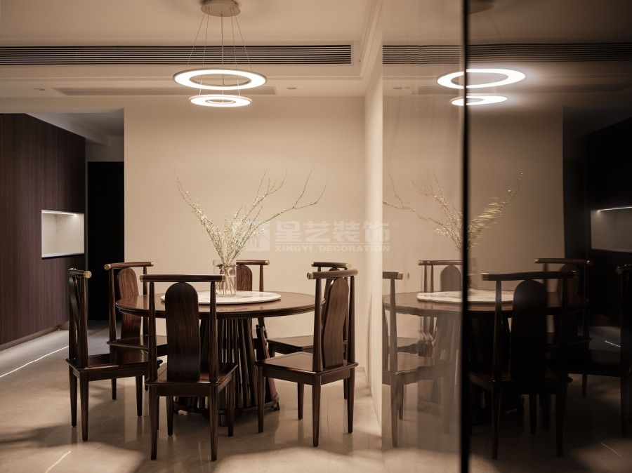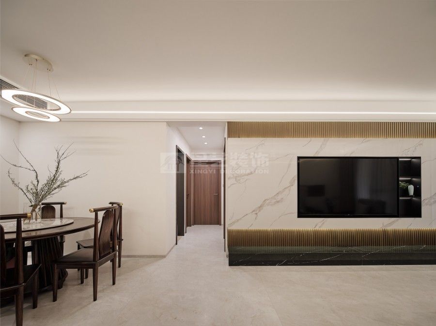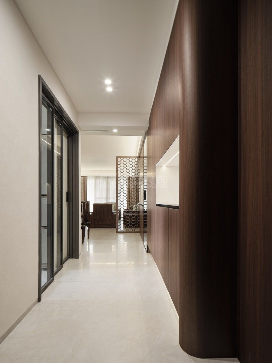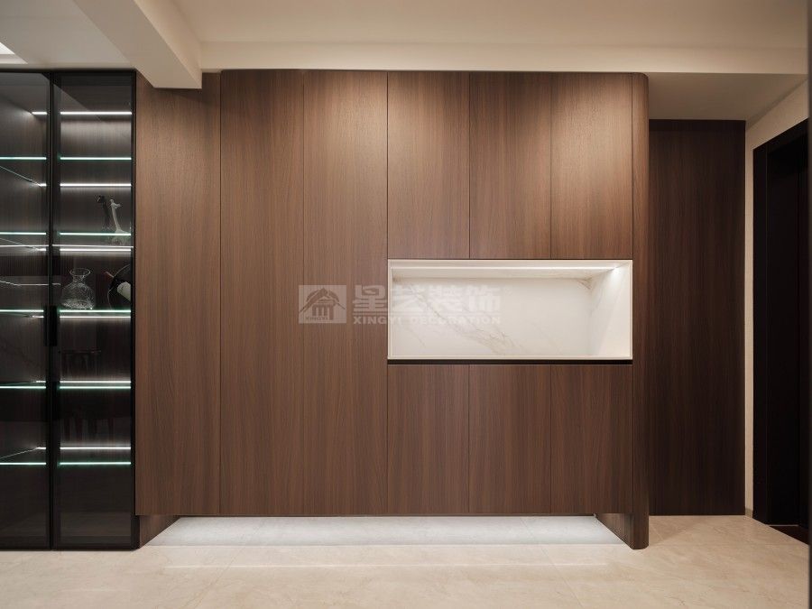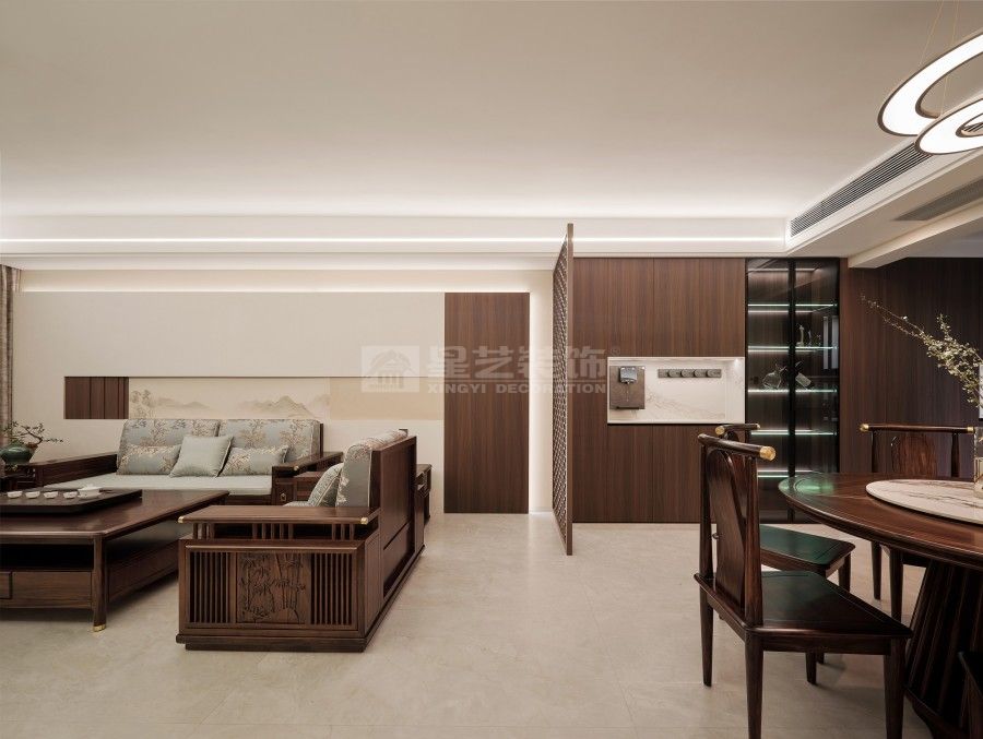 归家 · 尊崇之境 茶事闲情·候知己 设计需求:1.三个孩子,一男孩两女孩,两夫妻。需要收纳空间多,2.潮汕人喜欢中式 设计理念:发掘传统文化中的更多可能性,赋予每个设计以鲜明的个性和旺盛的生命力。打破传统的生活方式结合现代的生活方式,去繁从简,以人为本,促进空间人与人的互动性,还原生活的本质。 玄关柜延伸到餐边柜连体穿透式屏风设计整体增大空间感,同时让休闲阳台的光线通过屏风穿透到玄关处,的联动性与空间感。玄关柜圆角的处理手法避免进门磕碰细节与生活的考虑。祥云元素屏风彰显中式韵味。 厨房隐藏式推拉门的设计增大厨房门空间的通行性更具宽敞感。同时也考虑到让生活阳台的光线引入玄关处,补充玄关没有直接对外采光窗的问题。双一字型橱柜设计满足日常生活煮饭功能需求,零嵌入式大双门冰箱满足日常冷藏蔬果的需求。 晨起暮落的三餐四季,是平淡日常不可或缺的烟火气。 深色餐椅与餐桌配以浅色岩板转盆圆桌,优雅自如,岩板的在吊灯,吐露温润质感,圆形餐桌配置高靠背的餐椅选择因为业主做生意的,业主希望坐起来有靠山生意之道。 “柴米油盐酱醋茶,一日三餐度年华。”茶文化根植于博大的中华文明之中, 客厅茶几设计是快节奏生活的一味良药,含蓄内敛的禅意让人不由自主卸下重担。自然之景,山水肌理,绿植葱郁,与大面积木色调铺陈出典雅静谧的氛围,岁月绵长,茶香弥漫,一盏香茗,一抹斜阳,家人相伴,知己围坐,在茶中品味生活。开放式电视柜陈列与白色岩板在视觉上的一体化增强空间通感,绿植轻舞微风,白色窗纱律动,伴着婆娑光影,品茶观影。暖光巧妙渲染岩板与木纹栅格的肌理,还原生活本身的自然意趣。 栖息 · 宁静之地 慢调雅趣·安身心 夜深安眠,抛却烦忧,最能抚慰疲惫之躯。在横向大开间布局下,主卧空间集雅奢与闲逸于一体,步入此处,墙面艺术涂料面尽显温馨、衣柜与床头背景金属杆件和木质背景板在背光设计的床背尽显细腻的生活品质。沿袭东方意韵,衣帽柜延伸梳妆台设计,古朴与现代交织,典雅与实用并存,在素雅的氛围中,空间诉说着主人的故事与情怀。 次卧一化繁为简,榻榻米沿用飘台高度设计,床尾设计白色衣柜,反衬床头背景板肌理渗入时间的质感,搭配柔和的背光设计,使以现代的笔触勾画空间的雅趣与空灵。 次卧二上下铺设计巧妙融合衣柜设计收纳增加空间利用率,粉白色设计满足业主为两个女儿打造公主房设计,学习空间也是超大书桌设计满足两孩子独立学习空间。 东方美学,师法自然,内敛而宏大。在本案的设计中, 站在艺术场景化的高度上,以经历创造美,以无界思维融合现代再现东方意蕴的日常情景。 从器物、时空、身心的关系中,丰盈居者一家的生活感知,融雅奢入日常,静静叙说所见,所思,所爱。