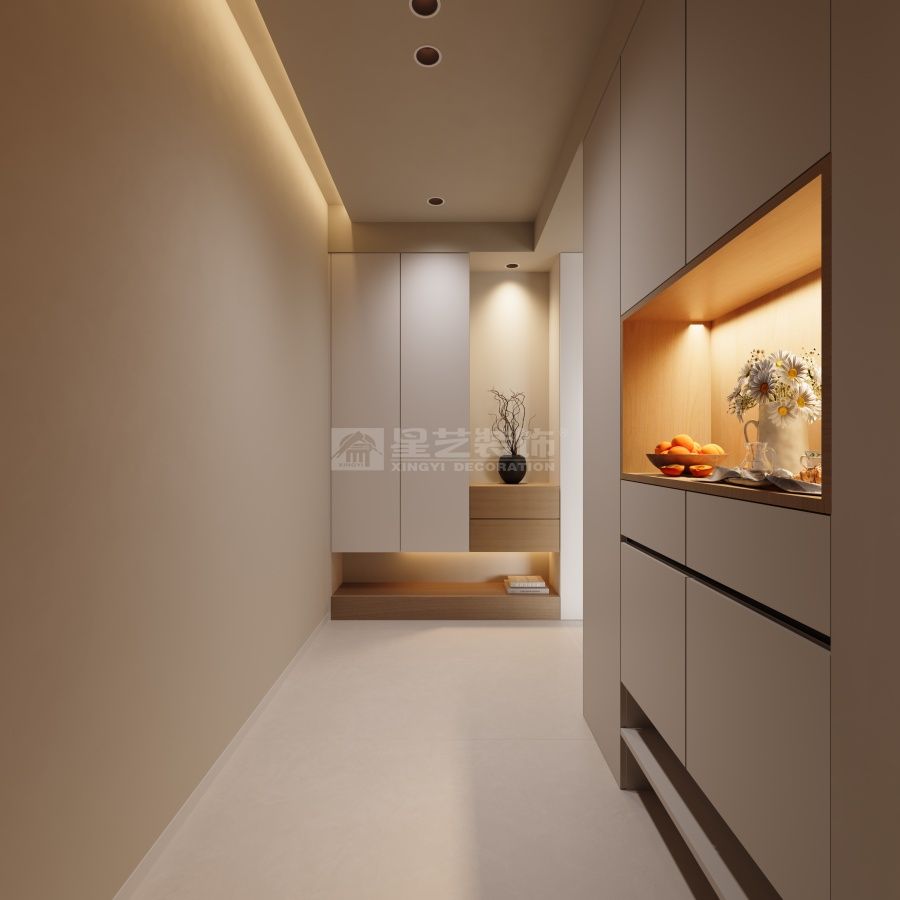入户走廊打造整面定制收纳柜,采用“封闭柜+开放展示格”的组合,开放格内嵌灯带摆放装饰摆件,封闭柜满足鞋帽、杂物的收纳需求;走廊顶面与墙面的线性灯延伸视觉,让狭长空间更显通透。