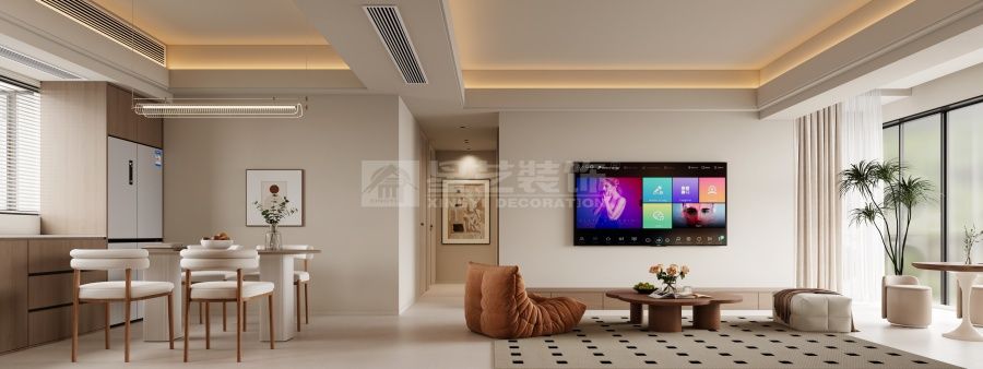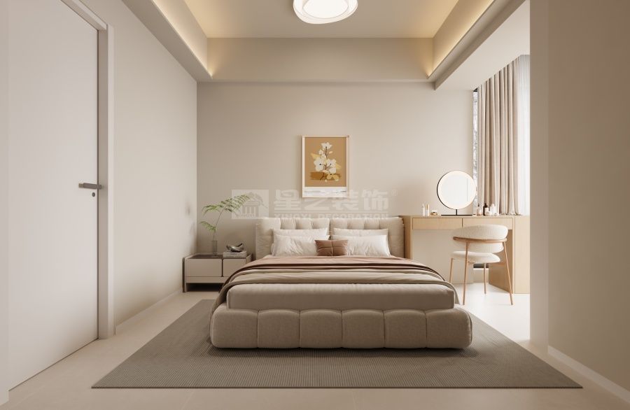 2. 材质搭配:地面通铺浅米色柔光砖,墙面采用哑光乳胶漆与木饰面结合,柜体选用肤感板材,搭配布艺软装与玻璃、金属等材质,在触感与视觉上都体现奶油风的细腻质感。