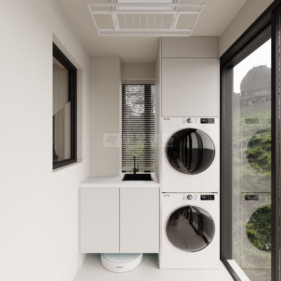 阳台打造垂直收纳系统,洗衣机与烘干机叠放设计节省空间,侧边定制洗手台与储物柜,顶部安装隐形晾衣架,兼顾洗衣、晾晒与储物功能,。