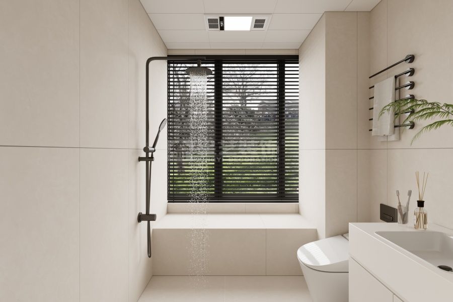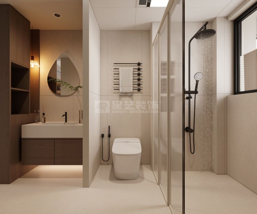 采用干湿分离设计,干区以木饰面搭配水滴形艺术镜,悬空浴室柜增加地面通透感;湿区选用浅米色瓷砖,黑色淋浴五金与玻璃隔断形成对比,内嵌灯带与筒灯结合,营造舒适的卫浴光环境。