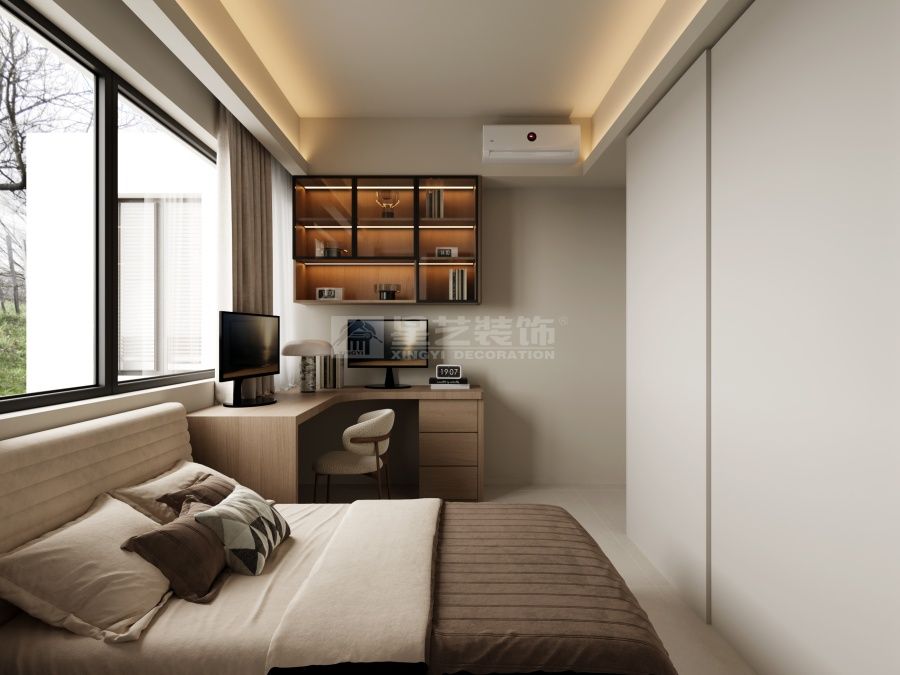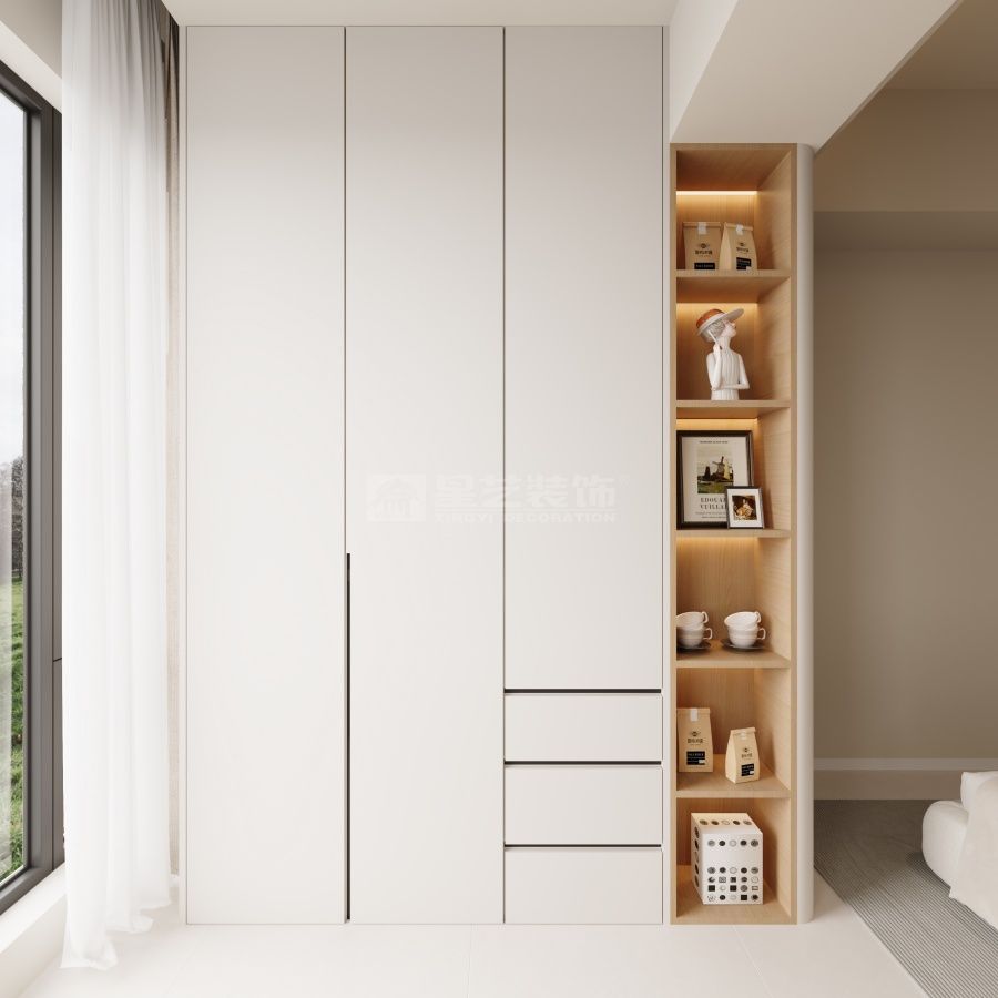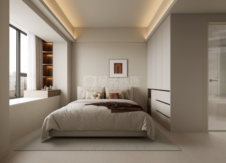 融合睡眠与办公功能,靠窗打造L型书桌,定制开放式书柜搭配内嵌灯带,满足办公与收纳需求;营造静谧的休憩氛围。次卧与儿童房延续整体色彩体系,以简约定制柜体为主,预留充足的活动空间,兼顾实用性与成长性。