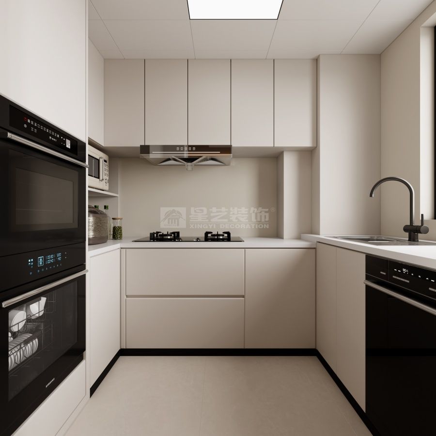 采用封闭式U型厨房布局,最大化利用操作动线,浅奶油色定制柜体搭配黑色嵌入式厨电(蒸烤箱、洗碗机等),形成色彩对比;,