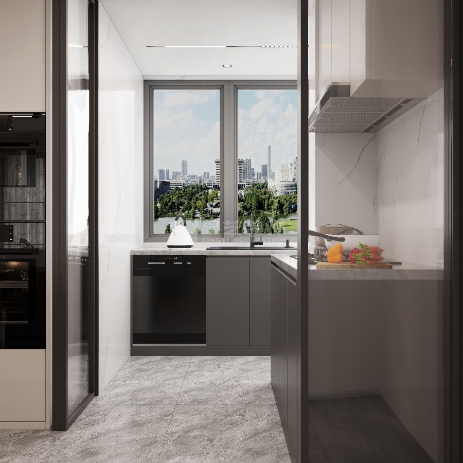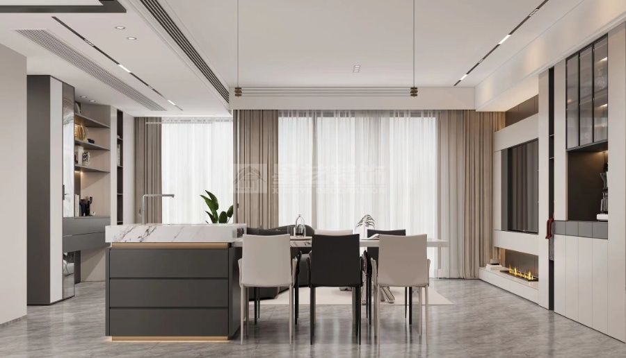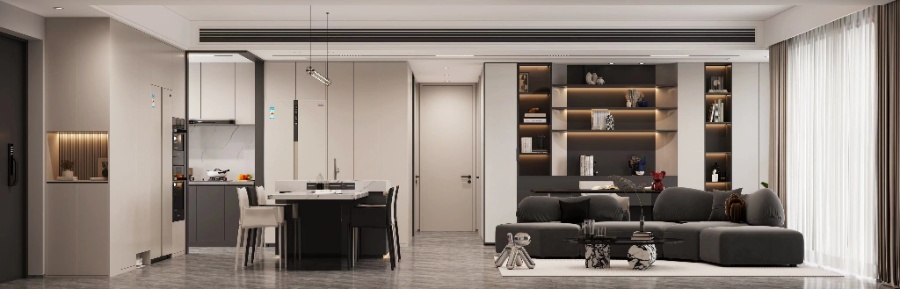 餐厨客一体化设计,以黑白灰 + 暖棕为主调,用简约线条、通透材质与隐藏收纳,平衡现代感与舒适感,借光影营造松弛的轻奢生活场域。