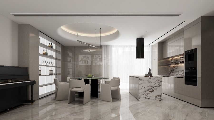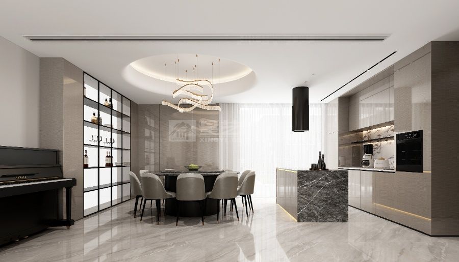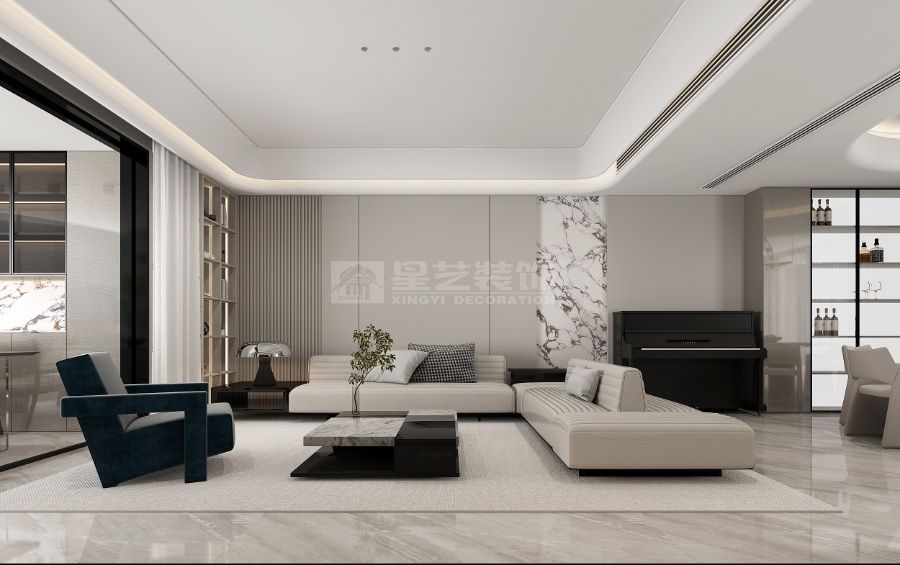 以灰白为底,融大理石纹理与金属线条,用藏蓝单椅点睛,柔光衬钢琴,在简约中揉入轻奢质感,营造雅致松弛的现代居境。