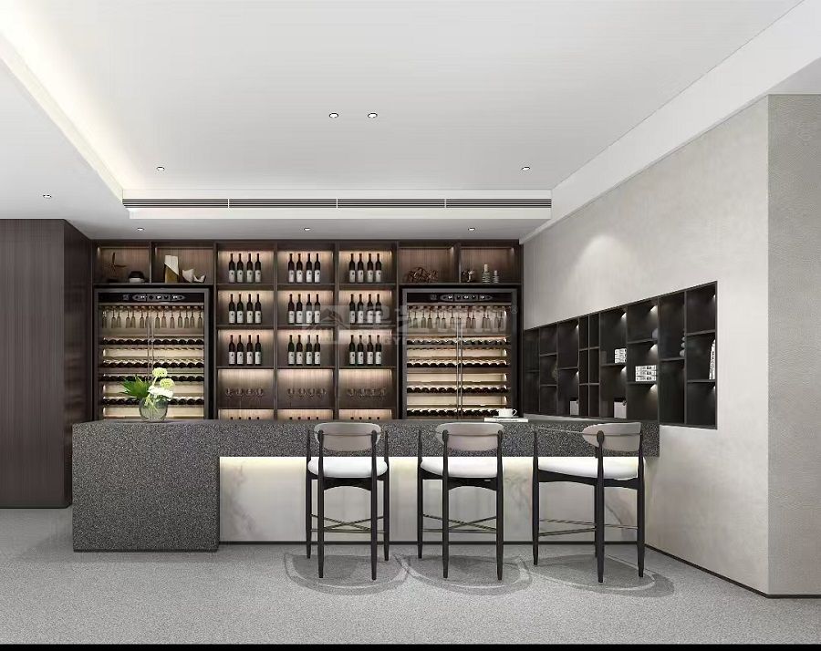 摒弃传统中式的繁复雕饰,提取东方美学中的对称、留白、禅意等核心元素,结合现代简约的线条与材质处理。深棕实木柜体与白色顶面形成冷暖对比,大理石、玻璃等现代材质的融入,让空间既有中式的沉稳,又不失现代的轻盈。