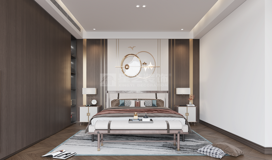 采用无主灯设计,通过射灯、吊灯、壁灯的组合实现光影的层次变化,重点照亮家具与装饰节点,强化空间的氛围感;软装选取线条简约的新中式家具,搭配水墨艺术画、中式花艺等陈设,将东方的诗意与禅意渗透到空间的每一处细节,让居住者在现代生活中感受传统