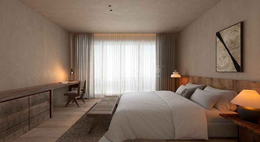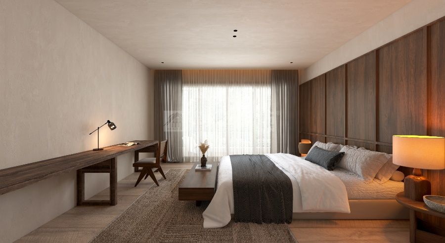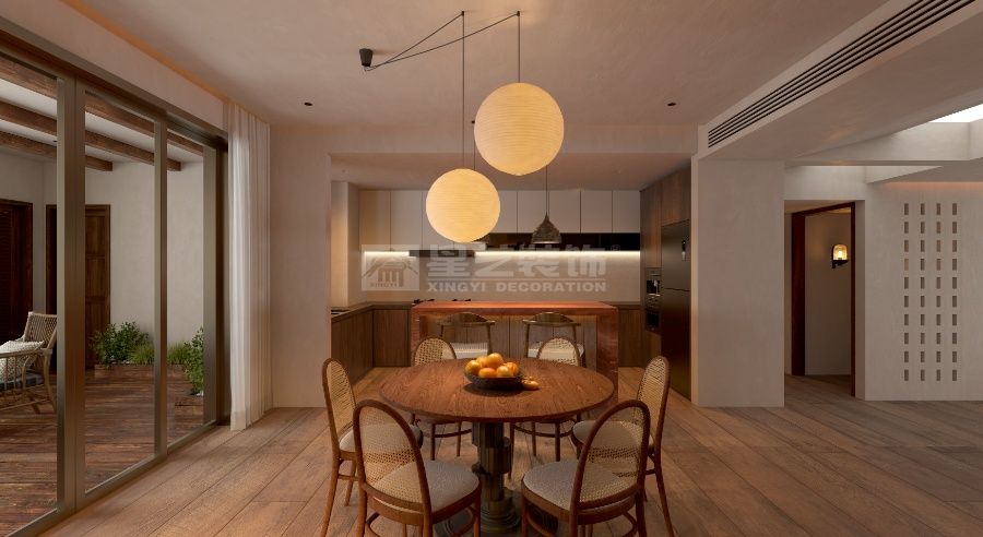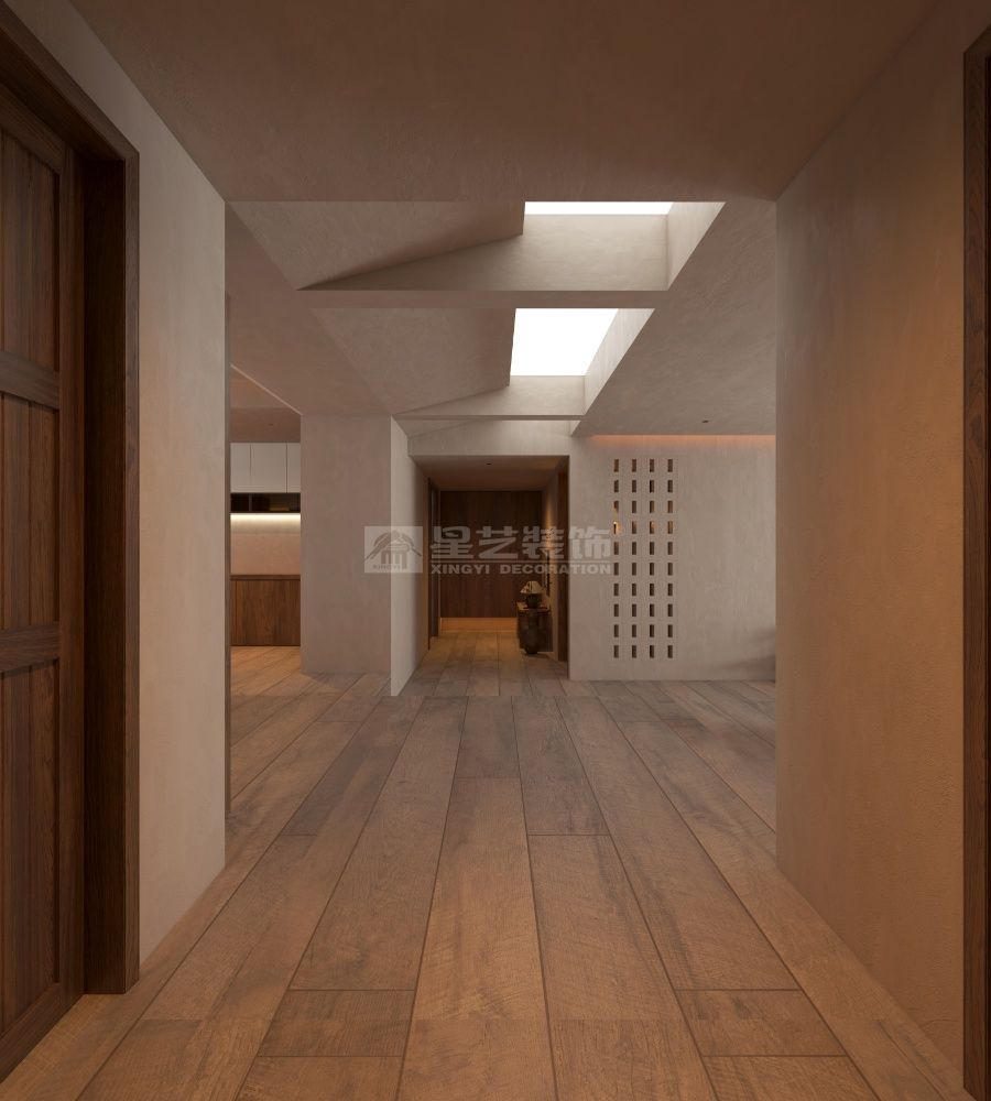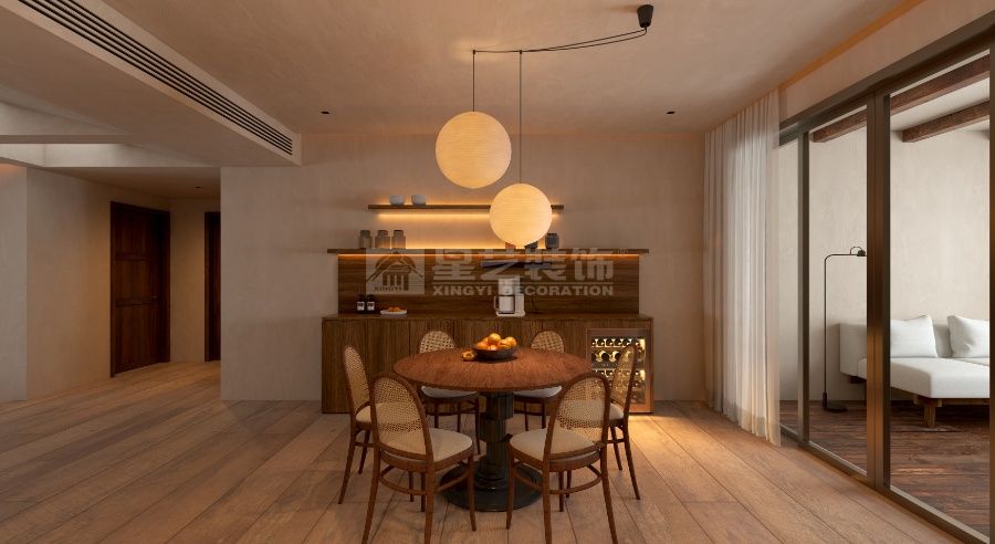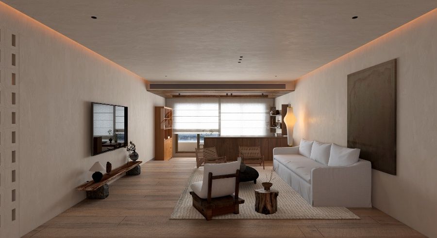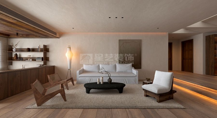 侘寂风客厅,以素色肌理衬静意,融木栅、石桌显自然质感,藏光引柔境,造松弛休憩 + 轻储物的疗愈生活场。