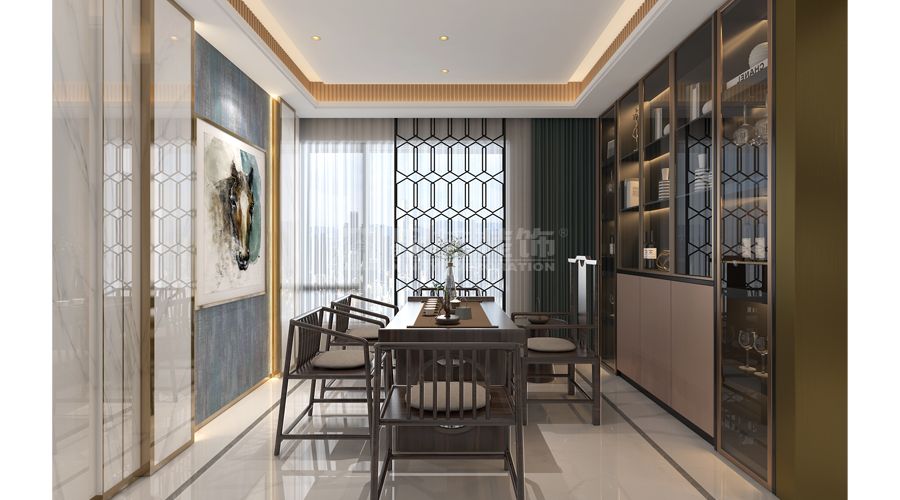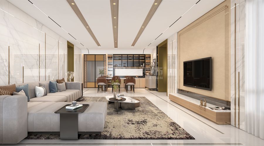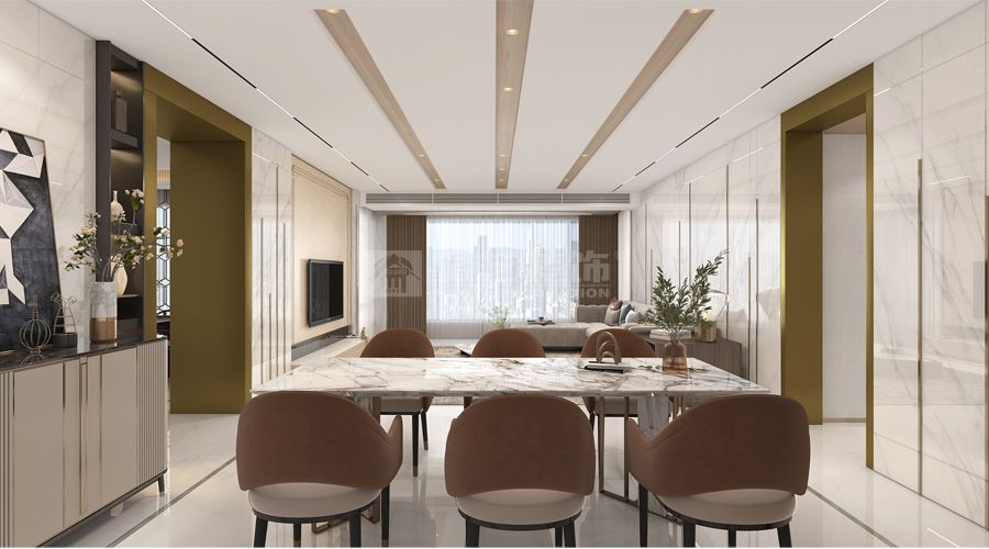 尚东君御:轻奢风格,运用白色石材、金色金属条及皮革,空间无主灯设计,尽显大宅奢华感
