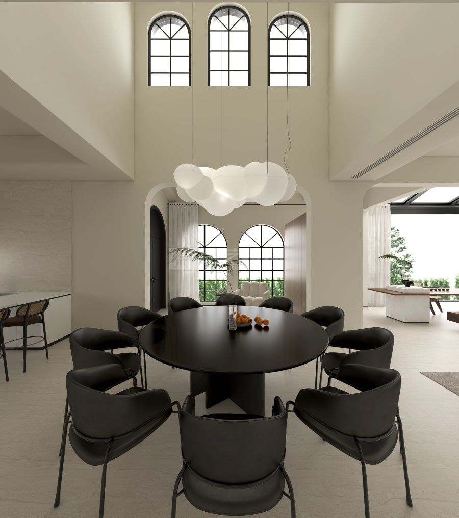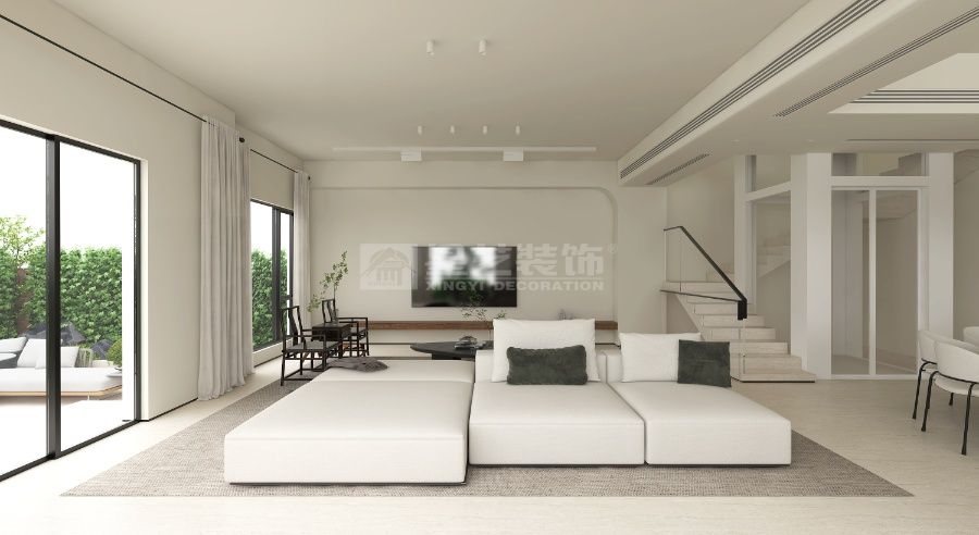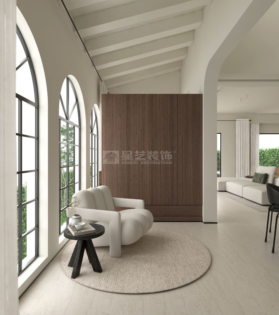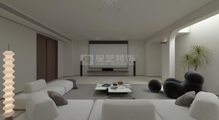 现代极简影音厅,以素调衬沉浸感,融环绕沙发 + 隐储柜拓舒适,柔光与弧拱柔境,造观影 + 休闲的松弛私享场。