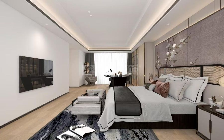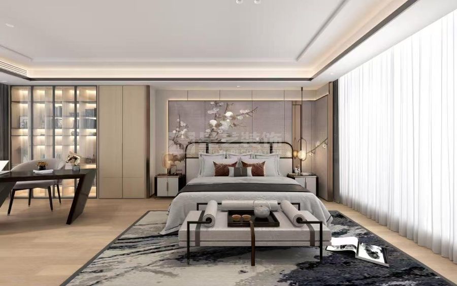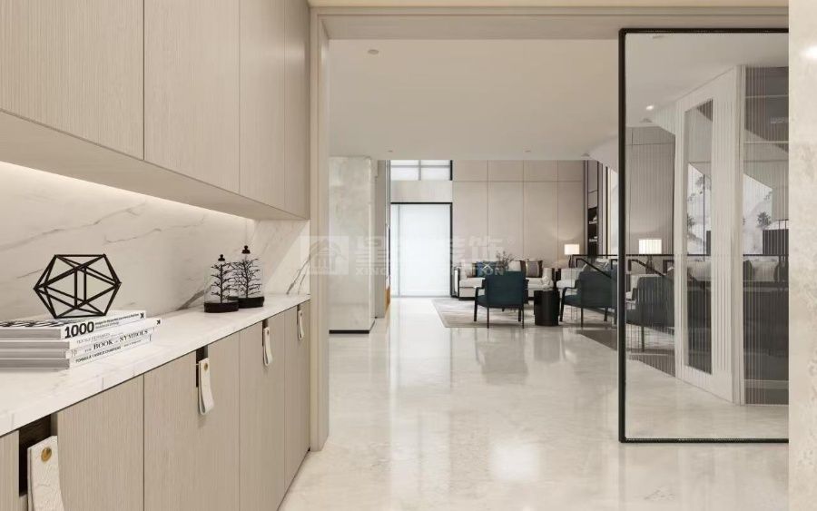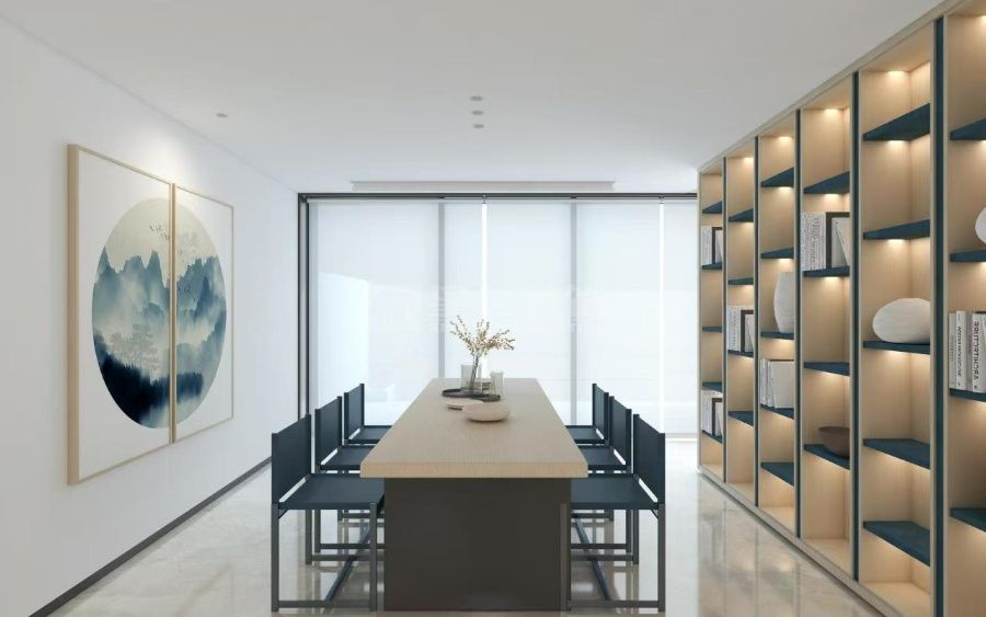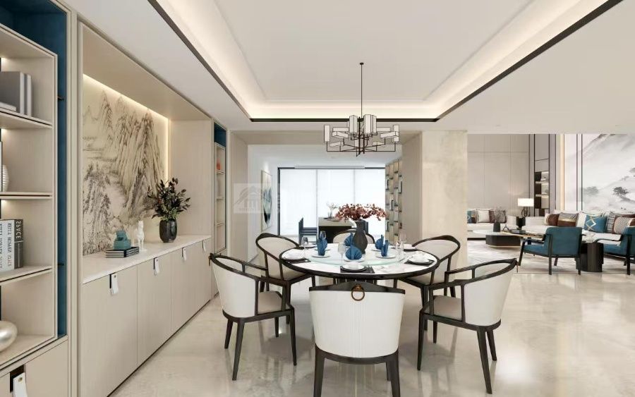 新中式餐厨,以山水饰画衬东方韵,融柜储 + 圆桌拓互动,浅调衬轻奢,造雅致用餐与通透联动的生活场。