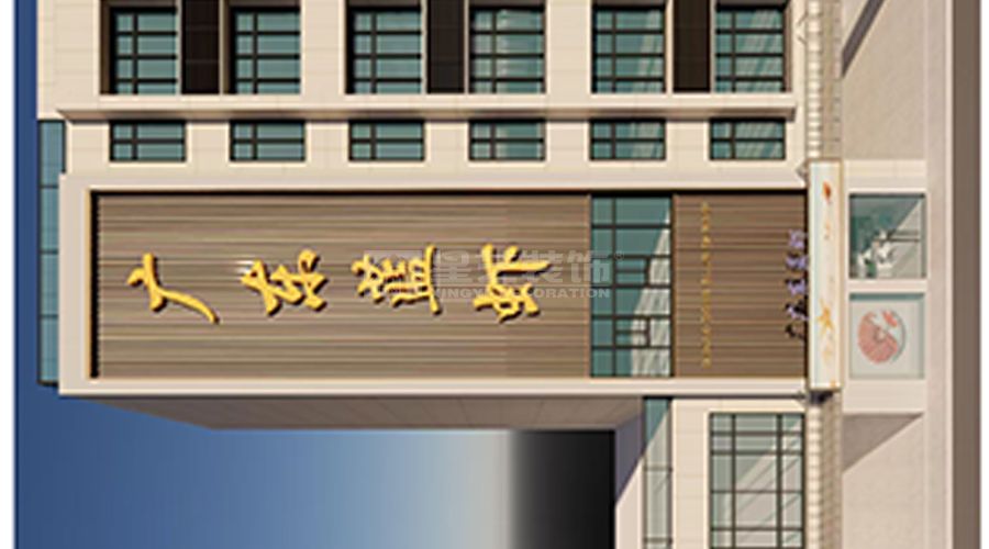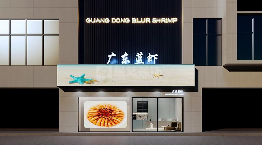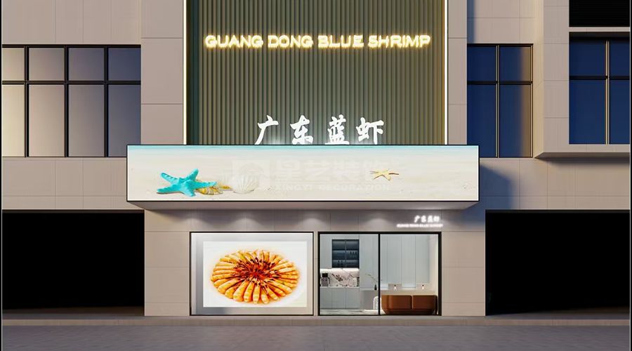 用木色的栅格外观,晚上的LED线灯勾勒出公司名。 大面积的透明橱窗内LED屏,播放着鲜美的南美海虾,肥美的鲍鱼······ 4米高的 门店,悬挂的U型造型,弧形的圆顶。让门店高,大,上。