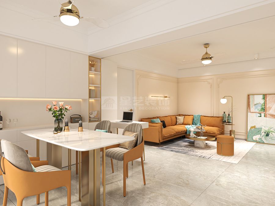 以爱马仕橙为空间注入奢华活力,局部翠绿点缀如自然精灵跃入视野,在高级灰基调中碰撞出艺术层次。金属线条与大理石材质勾勒轻奢骨架,橙色皮质沙发与丝绒绿椅形成质感对话,打造既热情又静谧的现代居所。