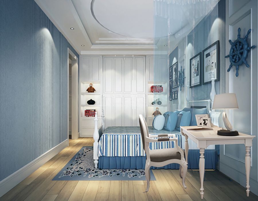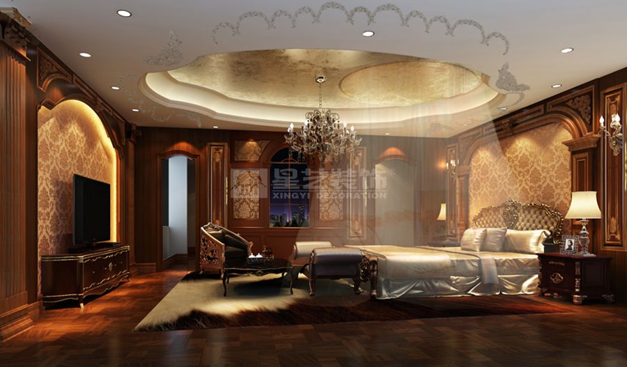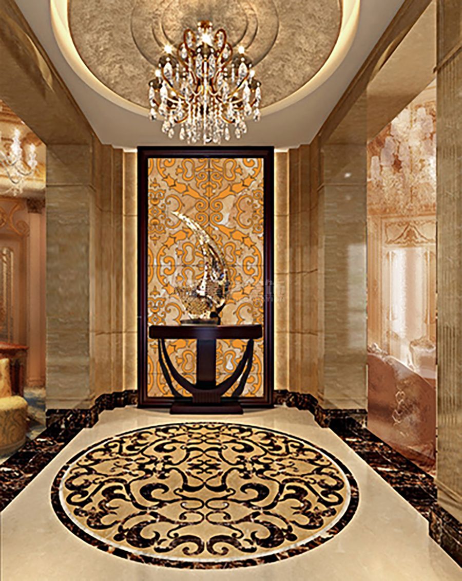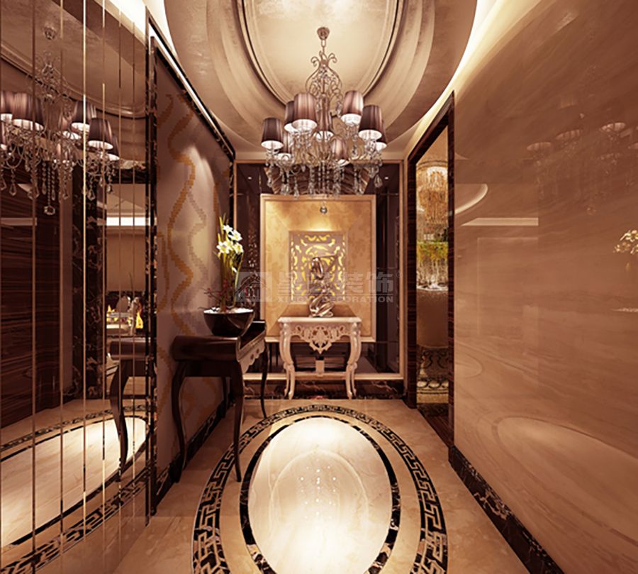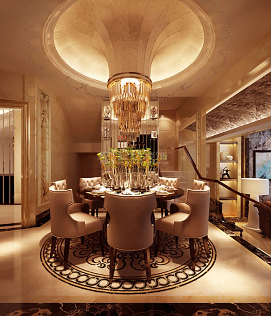 极度注重空间的对称性与逻辑性,常以中轴线为核心展开布局,无论是整体空间划分还是局部陈设,都追求平衡感与秩序感。例如客厅多采用“中轴对称+围合式”布局,沙发、茶几、壁炉或背景墙沿中轴线对称分布,搭配过渡性的玄关、走廊,构建出层次丰富、动线清晰的空间结构。同时,通过吊顶造型、地面拼花、墙面造型的分区设计,强化空间的纵深感与仪式感,避免单调空旷。