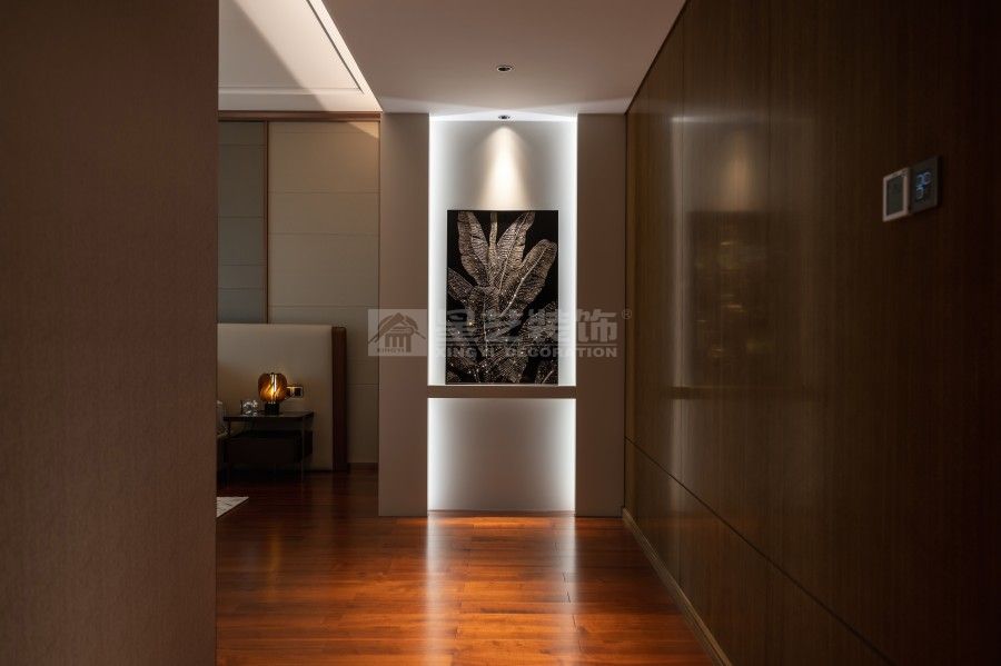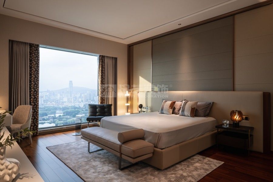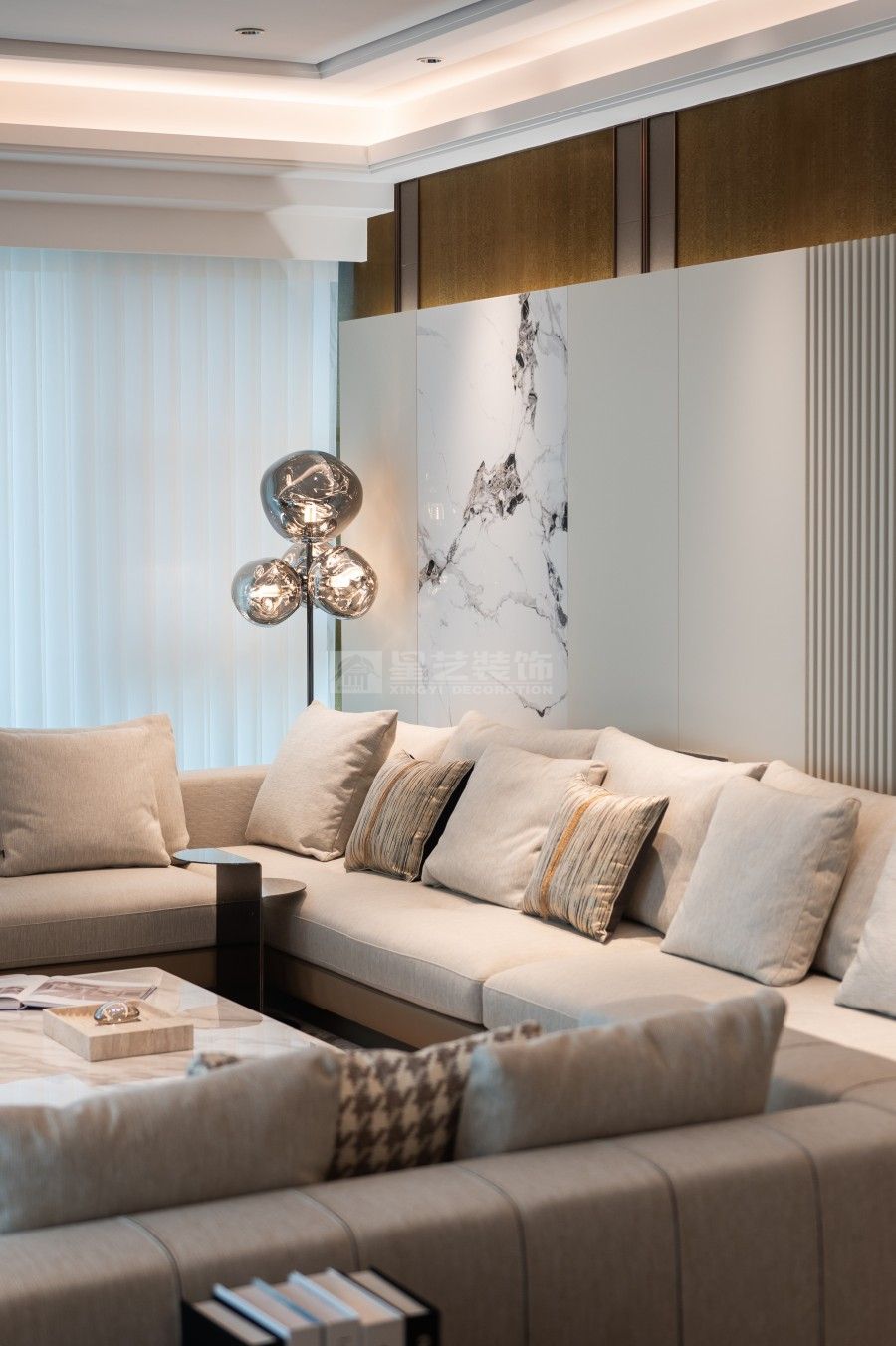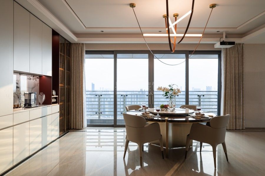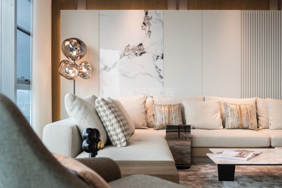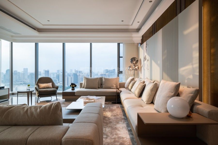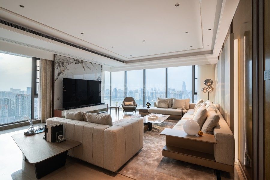 客厅以 “城市窗景与雅致松弛的共生” 为核心设计理念:借全幅落地窗将城市天际线纳入空间,让室内外景观自然衔接。浅米色软体家具 + 低饱和质感软装,营造松弛的居停氛围;大理石背景墙与金属灯具点缀,平衡柔和与精致。布局上以环形沙发围合出互动场域,既保留开阔视野的通透感,又通过细节材质的层次,让都市居所兼具 “观城的开阔” 与 “居家的温暖”。