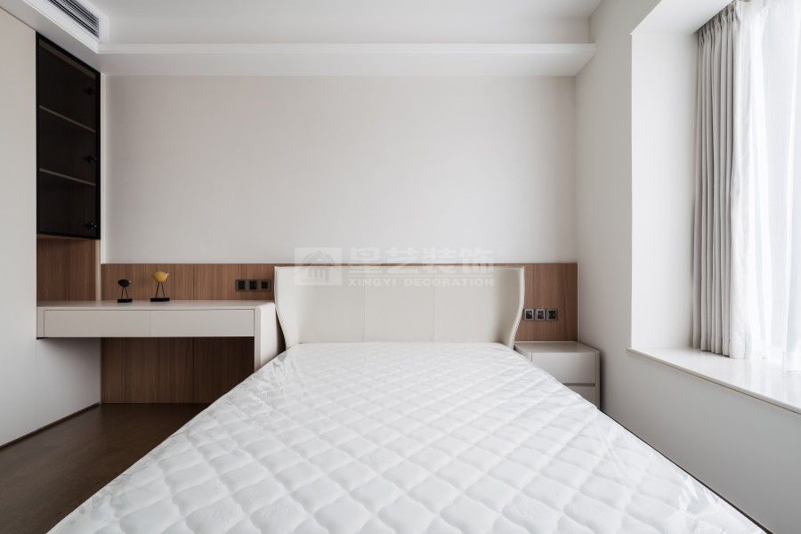 以 “极简留白的松弛起居” 为核心,用 “白 + 浅木” 的低饱和色调铺陈空间,消解小户型的局促感。一体化柜体整合床、书桌与收纳,功能隐形于简洁线条中,既满足休憩与轻办公需求,又保持视觉整洁。留白墙面与柔纱窗帘引自然光漫入,让空间更显通透;皮质床头与原木纹理的质感碰撞,在极简框架里注入温暖细节。设计以 “减法美学” 为思路,剥离冗余装饰,用功能与材质的克制平衡,让卧室成为兼具实用与静谧的舒适居所。