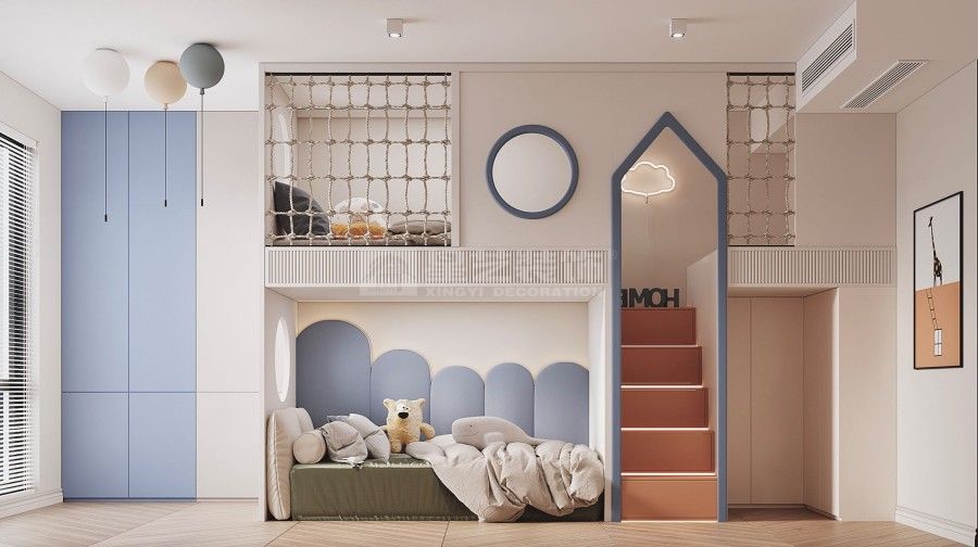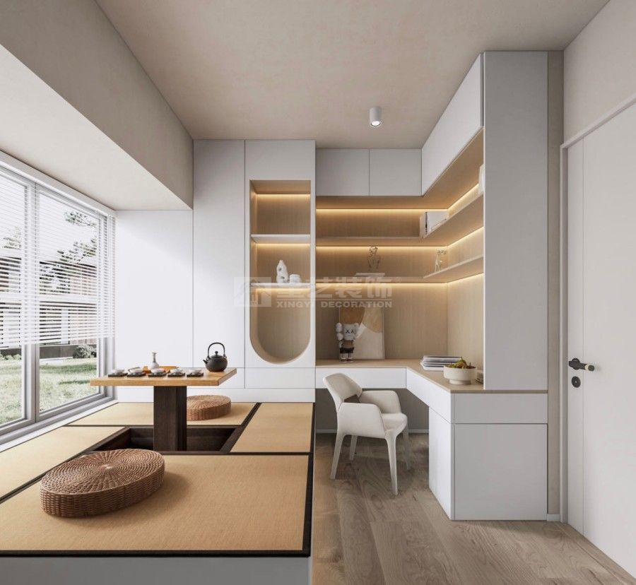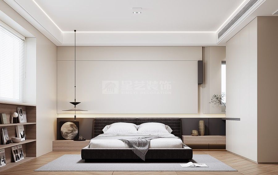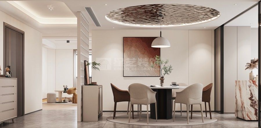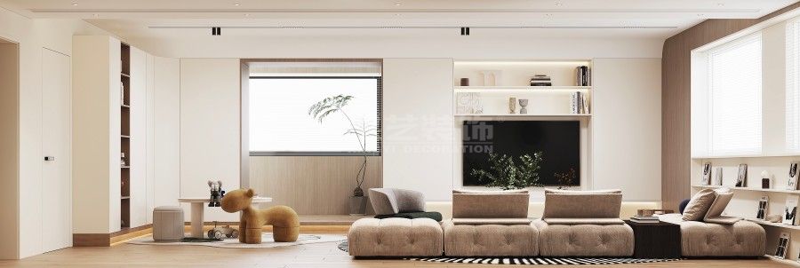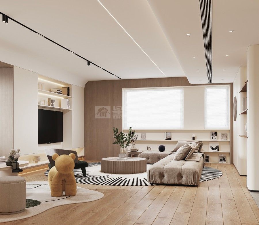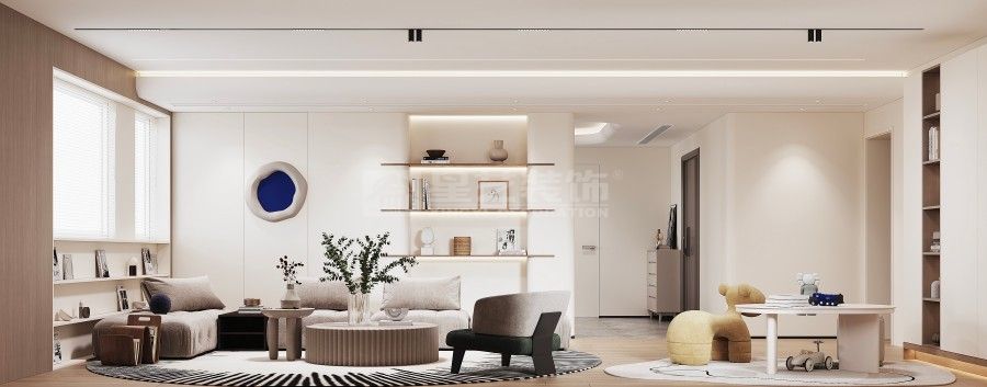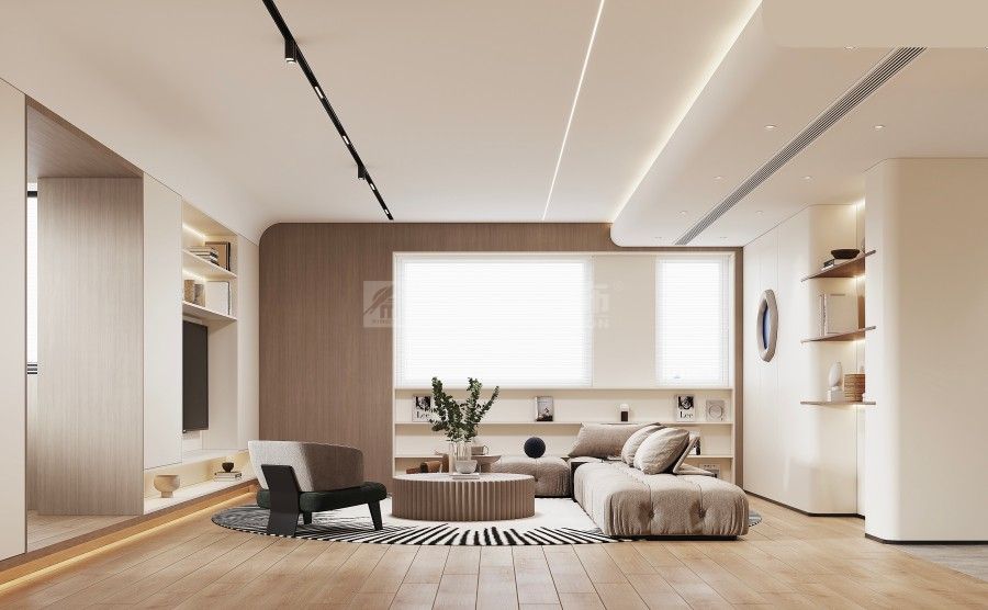 以现代中古风格为核心,将复古质感与现代简约相融。浅木色饰面搭配奶油白柜体,柔化空间轮廓;弧形布艺沙发、纹理感圆形茶几复刻中古经典,黑白几何地毯则注入现代张力。线性灯光与开放式收纳结合,在保留复古韵味的同时,兼顾现代生活的实用性,营造出慵懒又精致的居住氛围。