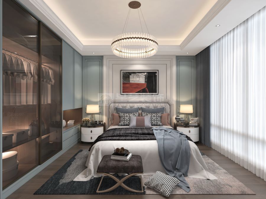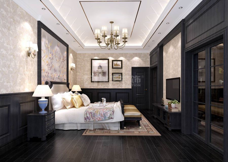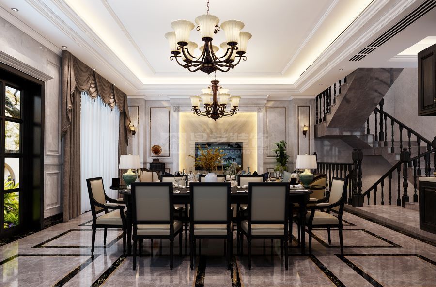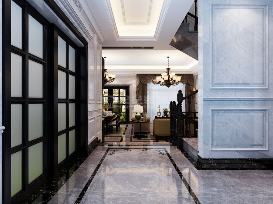 美式客厅风格较多采用嵌入式石膏吊顶,搭配精致的水晶吊顶,营造出一种怀旧、浪漫的感觉。以大理石作为地面装饰材料,光泽感佳,在沙发区铺上大幅花纹地毯,使空间区域划分更好用