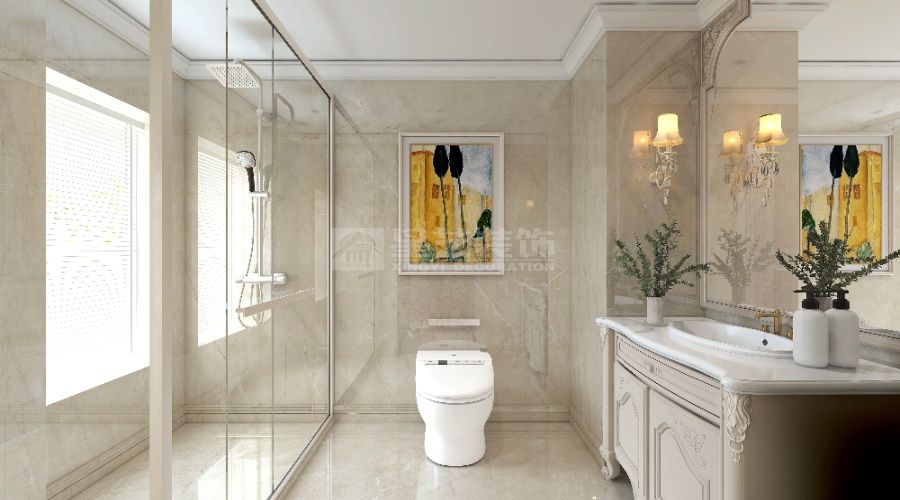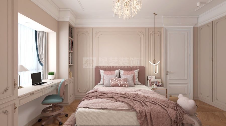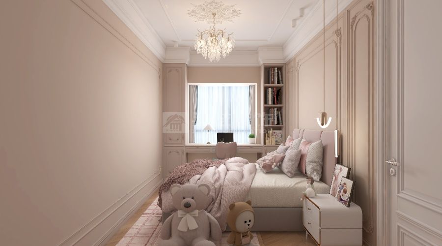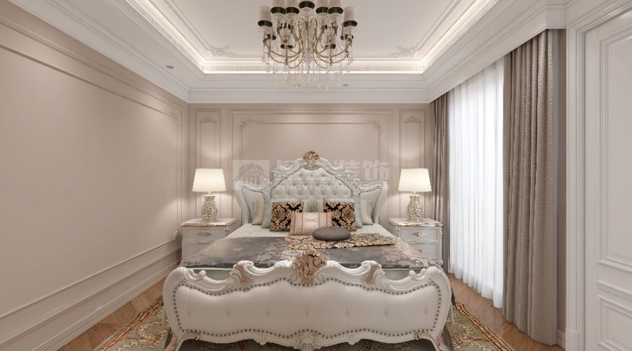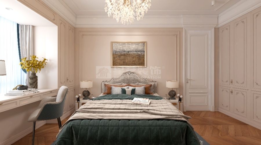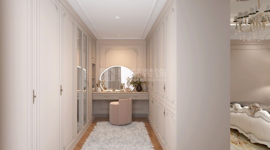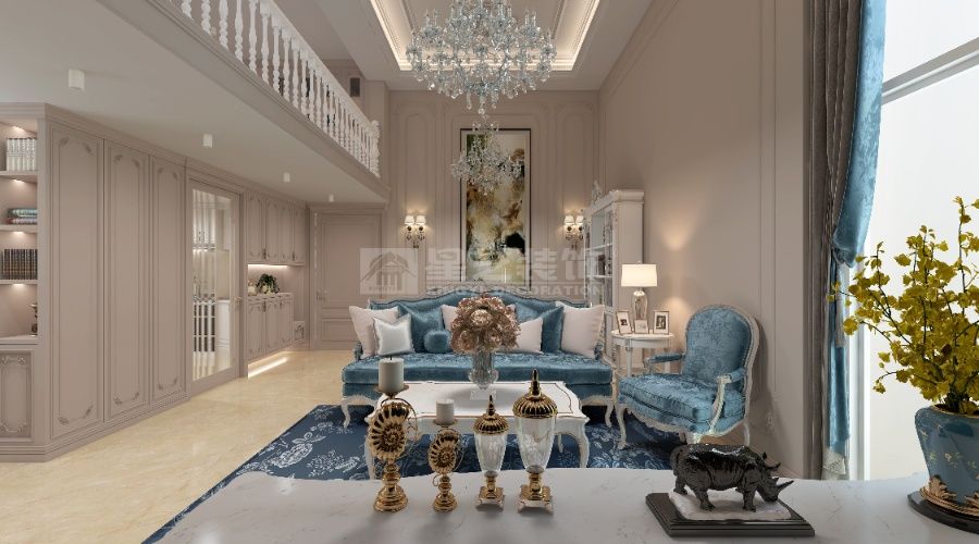 以法式轻奢为核,浅调基底衬水晶灯、雕花家具,挑空 + 通透柜体扩域,蓝白柔配缀奢饰,造优雅浪漫的精致栖居。