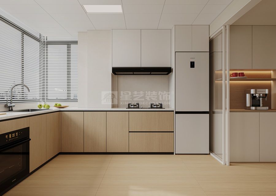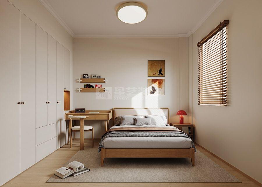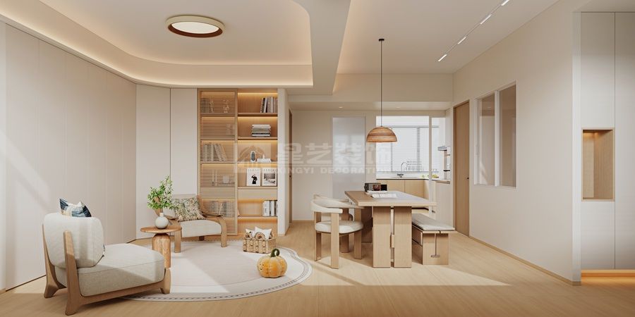 原木风去客厅化的设计:去客厅化并非取消客厅功能,而是打破传统客厅“电视为中心”的固化布局,以人的生活需求为核心重构空间,让客餐区成为兼具休闲、社交、办公、亲子等多元功能的复合区域,摒弃“沙发+茶几+电视”的刻板组合,本案以休闲座椅、开放式书架与餐区形成联动核心,既保留静坐休息、品茶阅读的休闲属性,又通过客餐无界设计,让家人互动、朋友小聚的社交场景更流畅,空间利用更灵活。空间里没有厚重的电视柜、大型茶几的堆砌,仅用轻盈的布艺家具、自然绿植点缀,让空间回归“舒适居住”的本质,契合现代人对居家松弛感的追求。