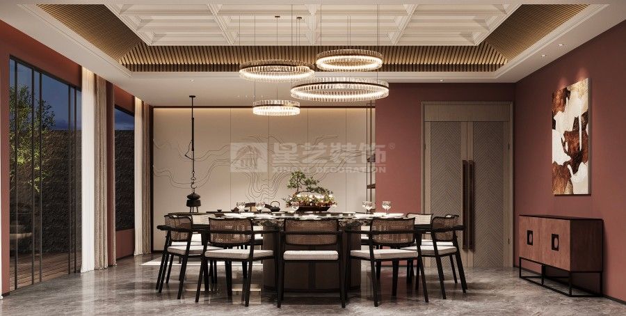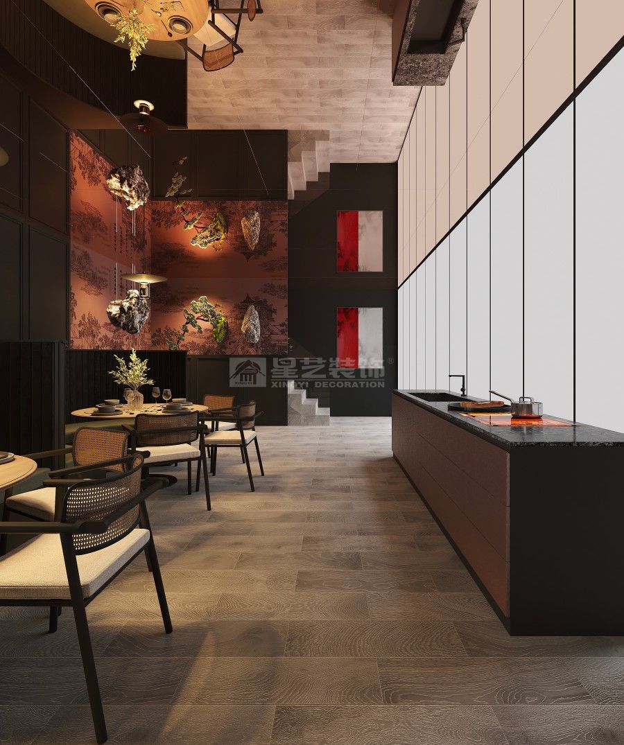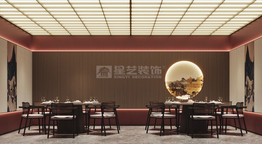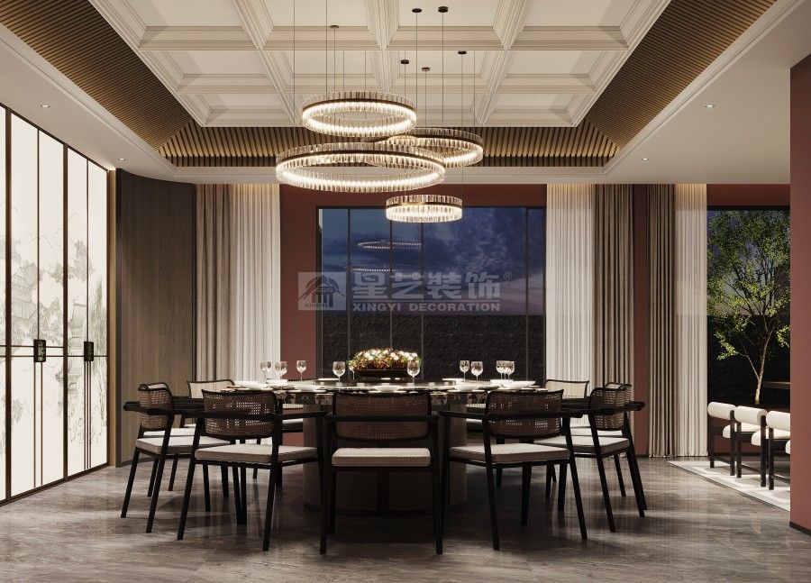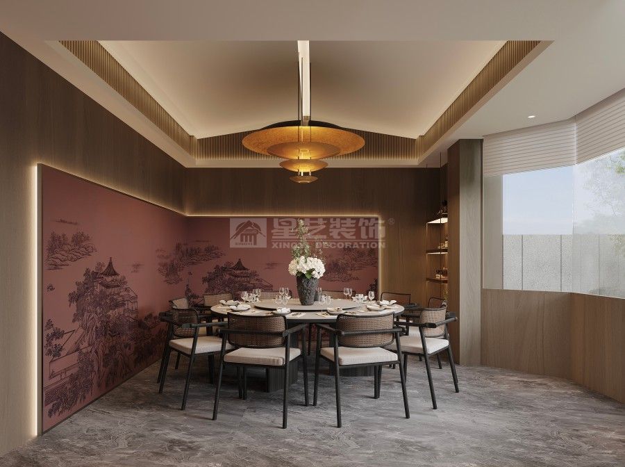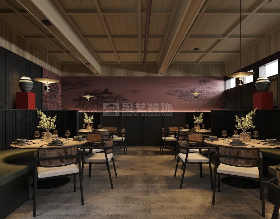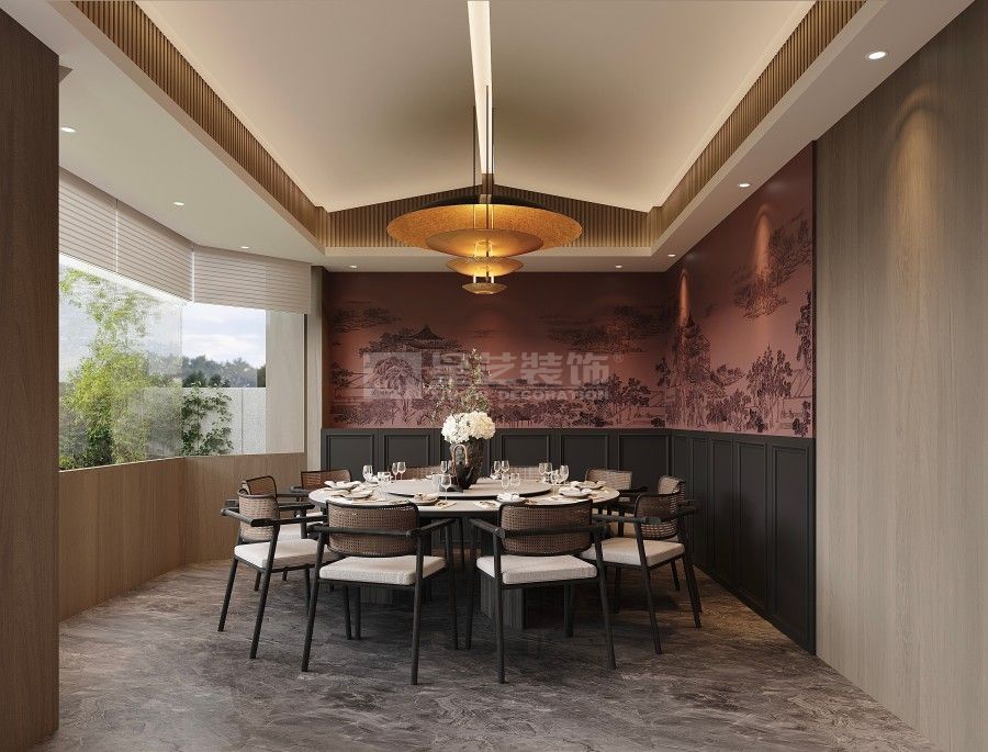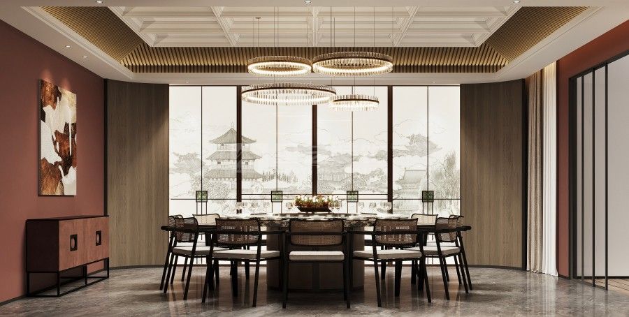 本餐厅以新中式风格为基底,融合东方美学与现代设计语言。深木色格栅、古意山水壁画勾勒出江南园林的雅致意境,豆沙红墙面与黑色金属线条碰撞,平衡了传统的厚重与现代的利落。藤编座椅、圆形餐台延续中式团圆理念,灯光与软装的细节铺陈,让食客在现代空间中沉浸式感受东方饮食文化的诗意与仪式感。