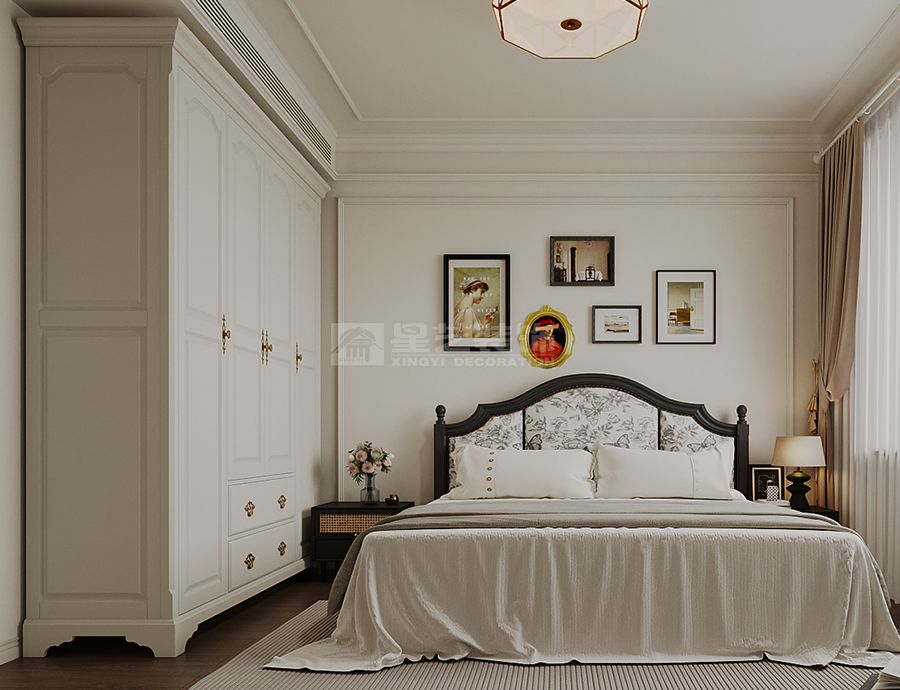 本案采用“低饱和治愈系配色+天然材质+复古软装”三大核心策略,以奶油色、奶咖色、焦糖棕为基调,通过石膏线条勾勒法式精致感,用拱形门洞柔化空间过渡,以人字拼木地板奠定温润底色。轻法式的浪漫骨架中,藤编、实木、黄铜等中古元素的植入,让空间在优雅之余更添一份时光沉淀的温度。