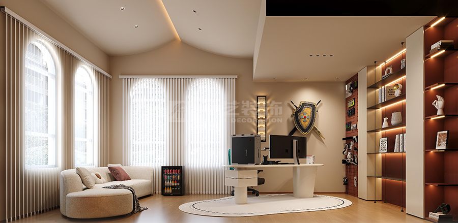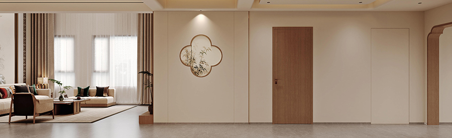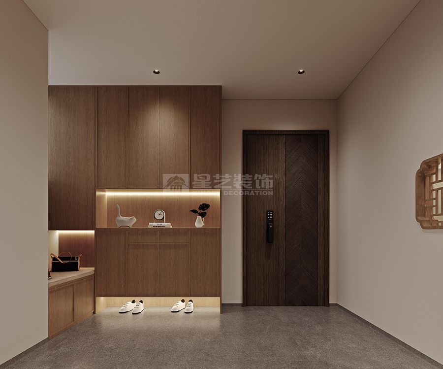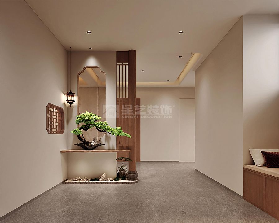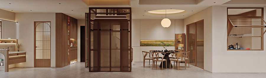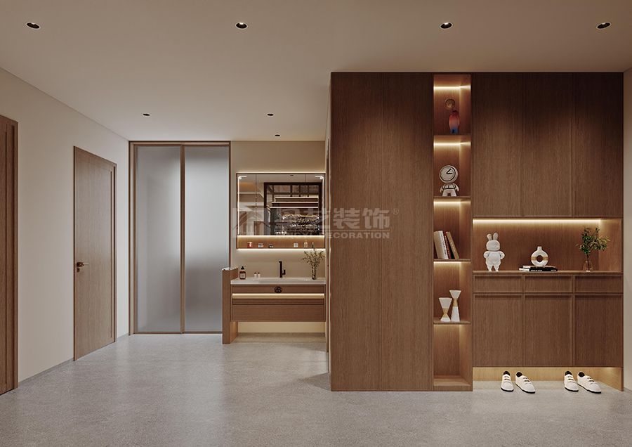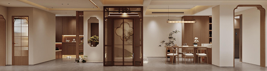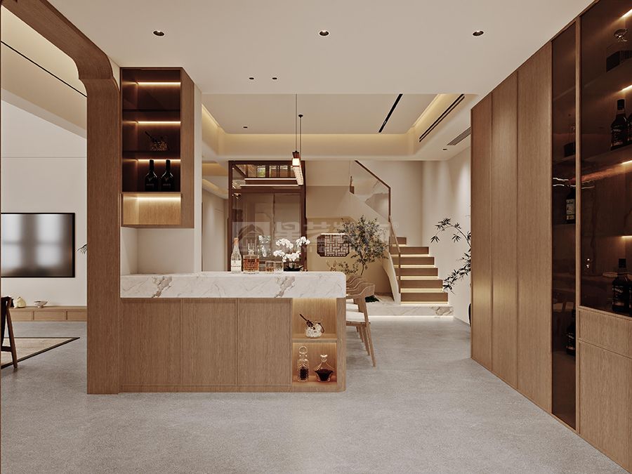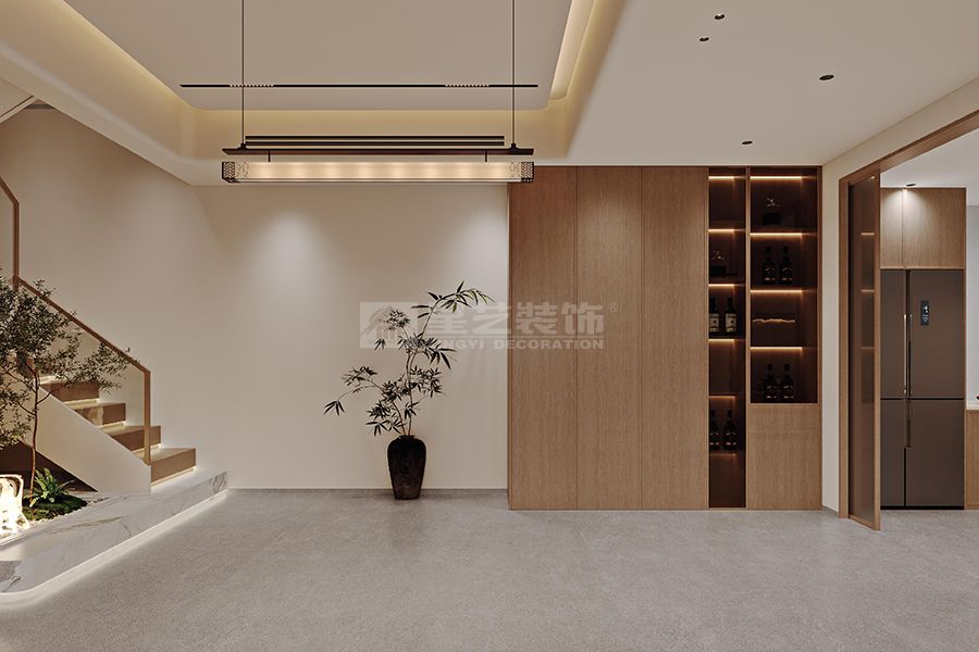 本案以 “东方雅韵” 为核,融合现代简约的通透与温润,打造兼具禅意意境与舒适质感的高端居所。整体空间运用温润木饰面、细腻米白墙顶与大理石材质,构建简约大气的基底;通过无主灯光影层次、竖向格栅与留白布局,营造静谧松弛的氛围。玄关、客厅、楼梯等区域植入绿植盆景、花格窗棂等东方元素,于细节处传递文化底蕴。客餐厅一体化布局兼顾通透与实用,在传统美学与当代生活之间找到平衡,为居者营造出 “简而不凡、静而有韵” 的雅致生活场域。