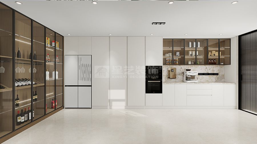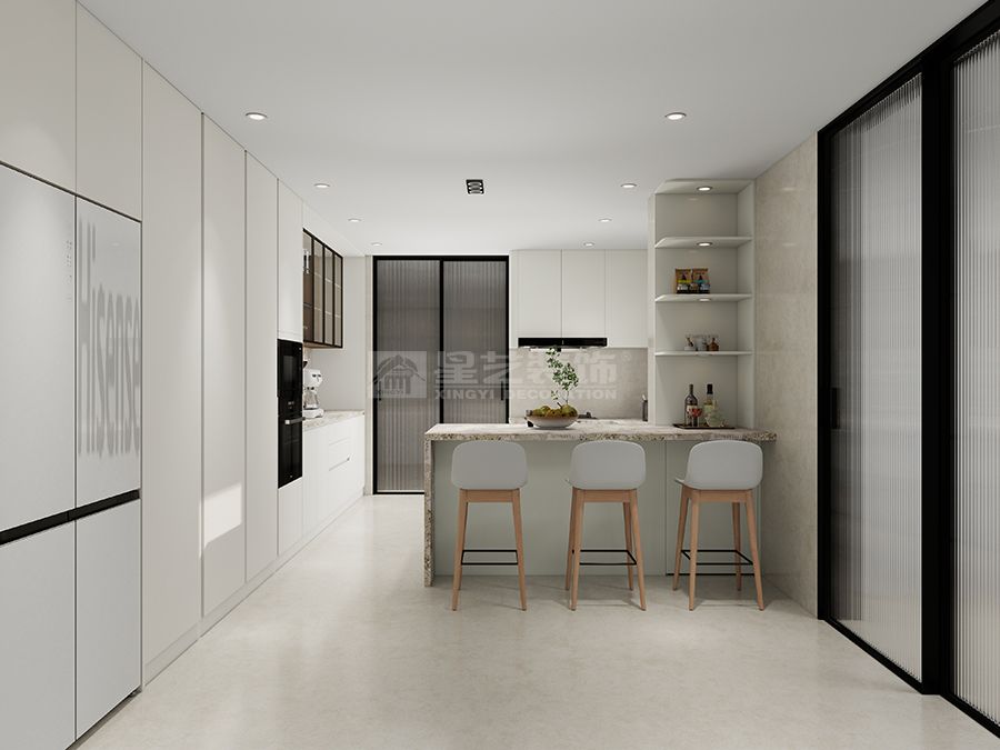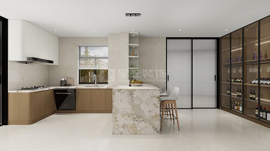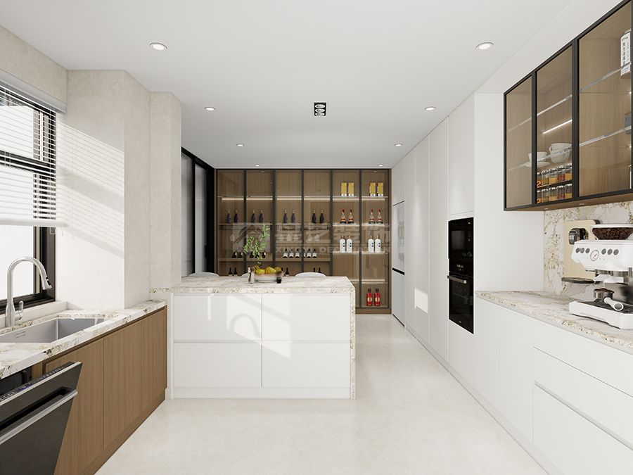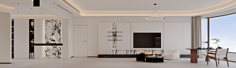 设计摒弃繁杂装饰,以大面积奶白 + 暖木调和空间氛围,辅以大理石纹理与金属线条点缀,构建简约大气的基底。通过无主灯设计与线性光影,营造层次分明的静谧氛围;客餐厅一体化布局,配合大面落地窗,最大化引入自然采光,强化空间开阔感。