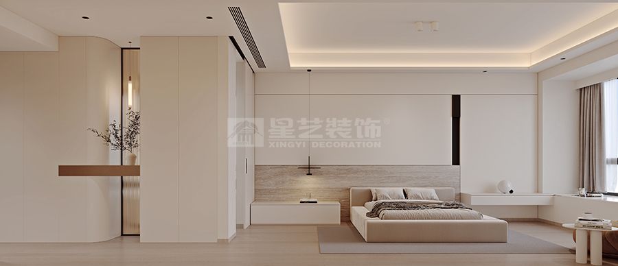 卧室区域注重静谧与收纳效能,以柔和材质与简洁线条提升居住舒适度;客厅则通过岩板背景、悬浮柜体与精致软装,在极简中注入细节质感。整体设计克制而不失温度,于简约中见高级,在美学与实用之间找到完美平衡,为居者营造出舒适高级、历久弥新的生活场域。